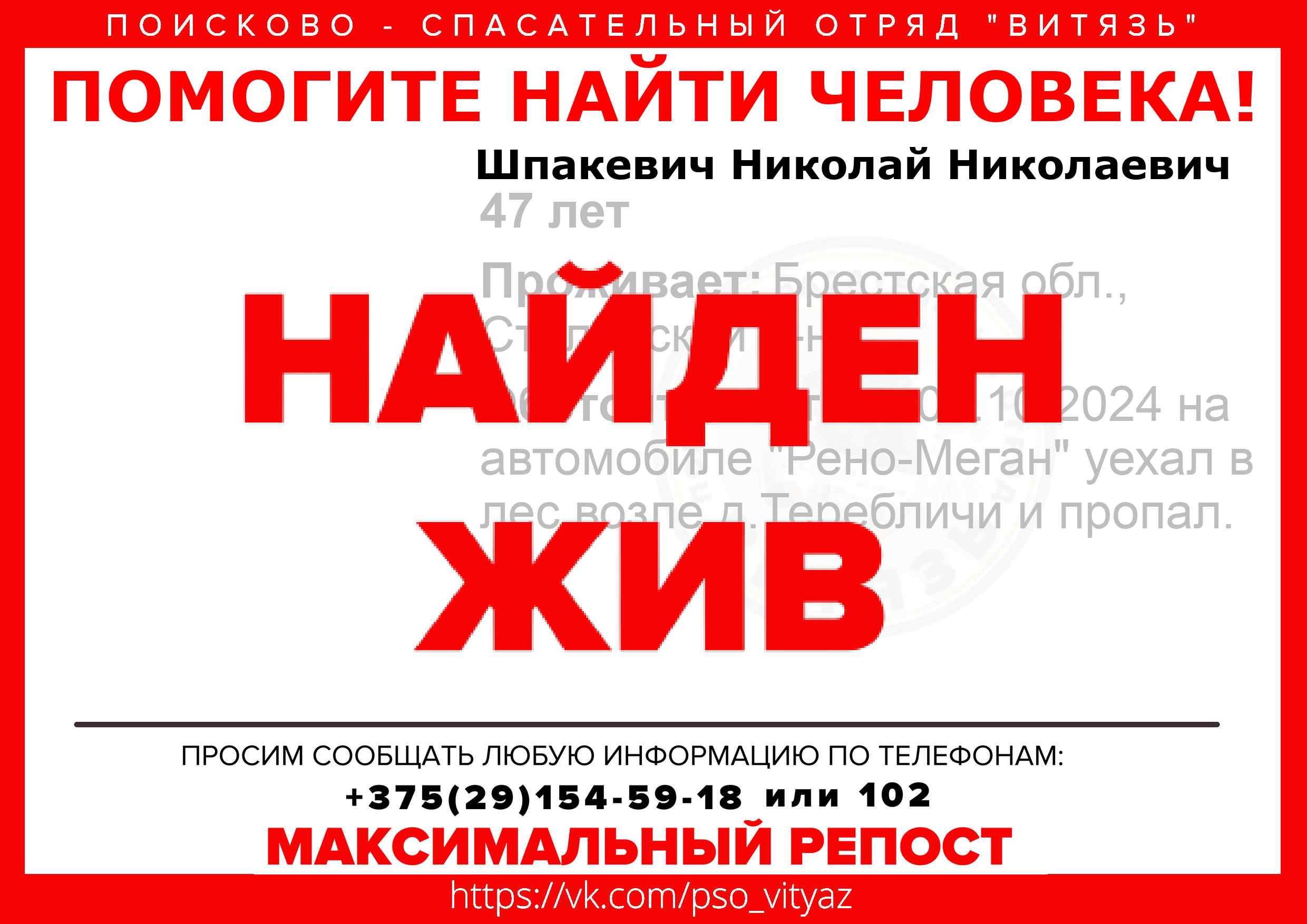 Всех, кто владеет информацией, просим сообщить: ПСО "ВИТЯЗЬ" +375(29)154-59-18 |