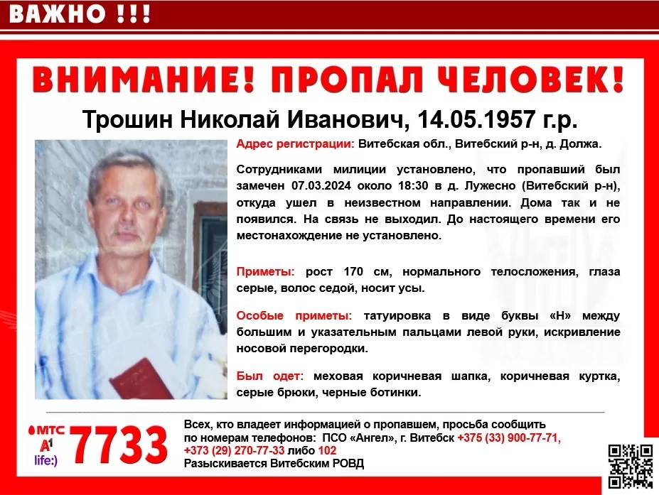 Всех, кто владеет информацией, просим сообщить: ПСО "Ангел" г.Витебск +375(33)900-7771 |