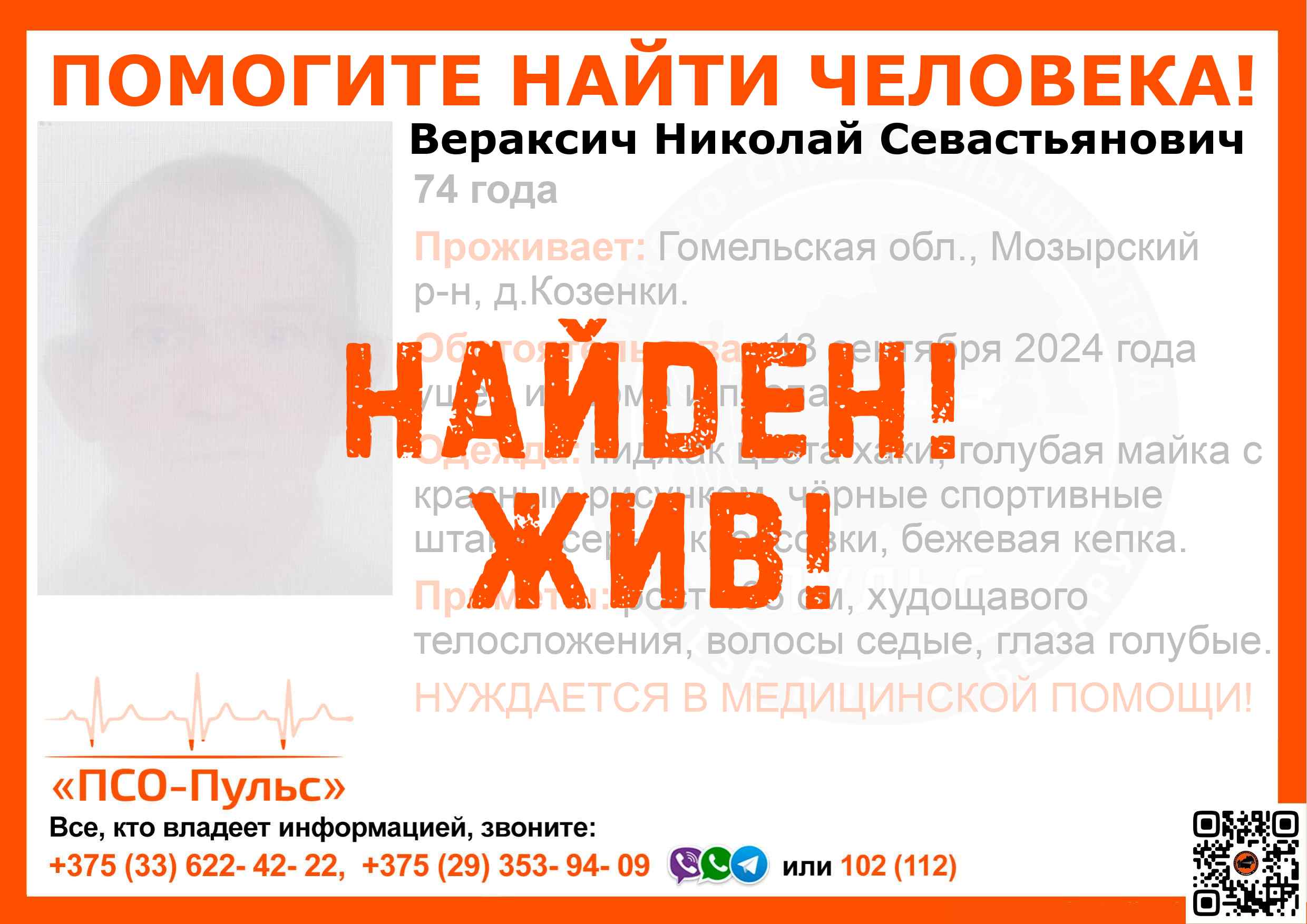 Всех, кто владеет информацией, просим сообщить: ПСО "ПСО-Пульс" +375(33)622-4222 |
