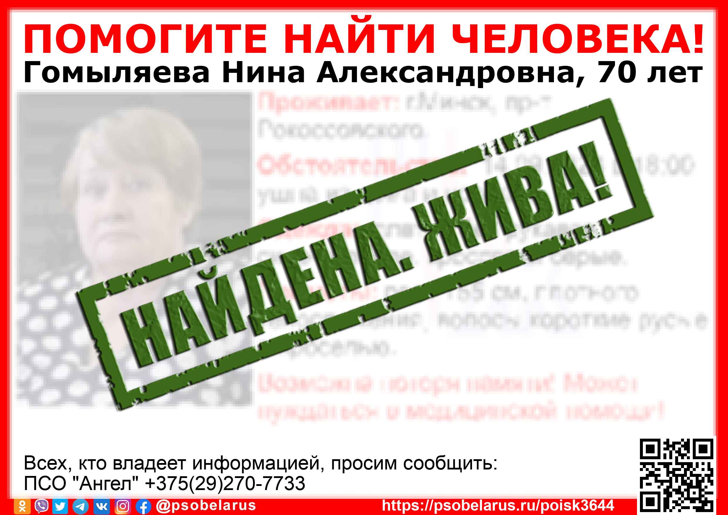 Всех, кто владеет информацией, просим сообщить: ПСО "Ангел" +375(29)270-7733 |