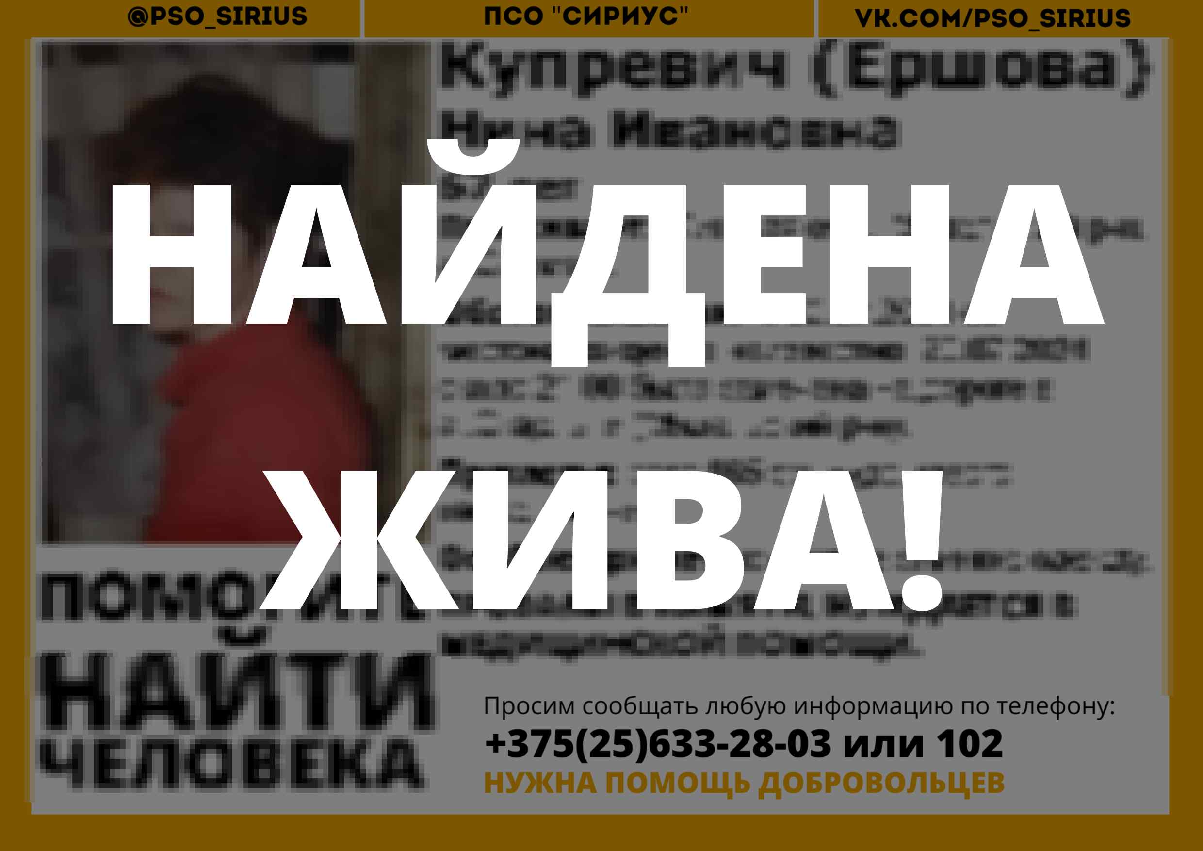 Всех, кто владеет информацией, просим сообщить: ПСО "Сириус" +375(25)633-28-03 |