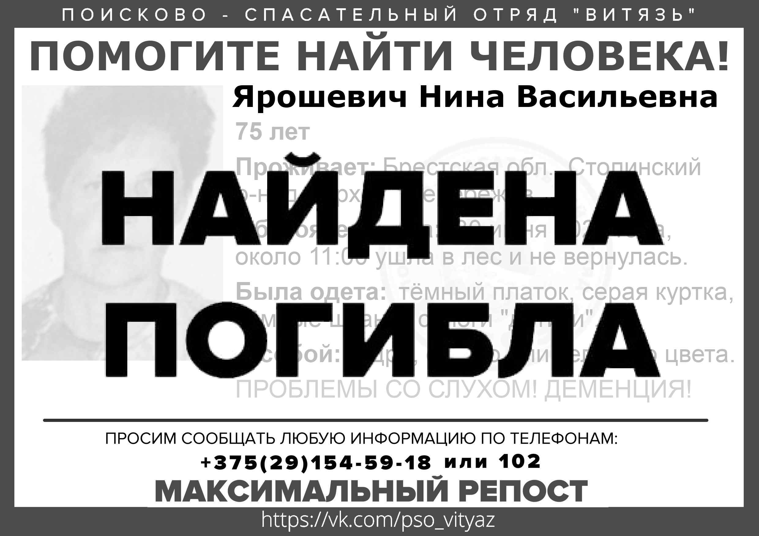 Всех, кто владеет информацией, просим сообщить: ПСО "ВИТЯЗЬ" +375(29)154-59-18 |