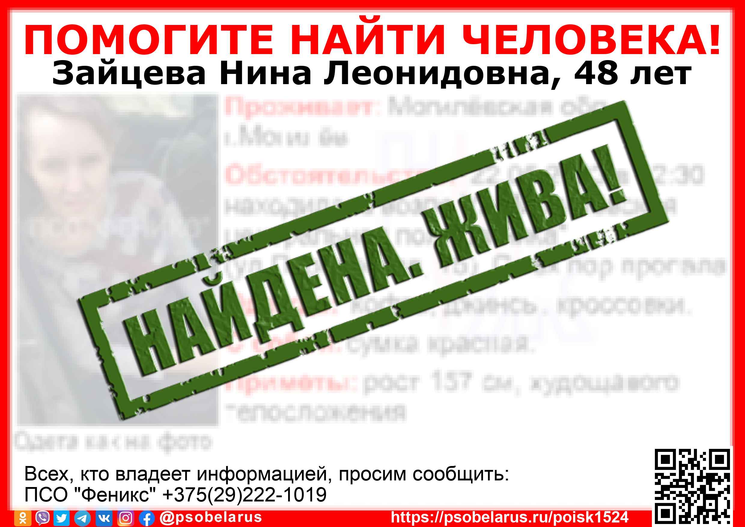 Всех, кто владеет информацией, просим сообщить: ПСО "Феникс" +375(29)222-1019 |