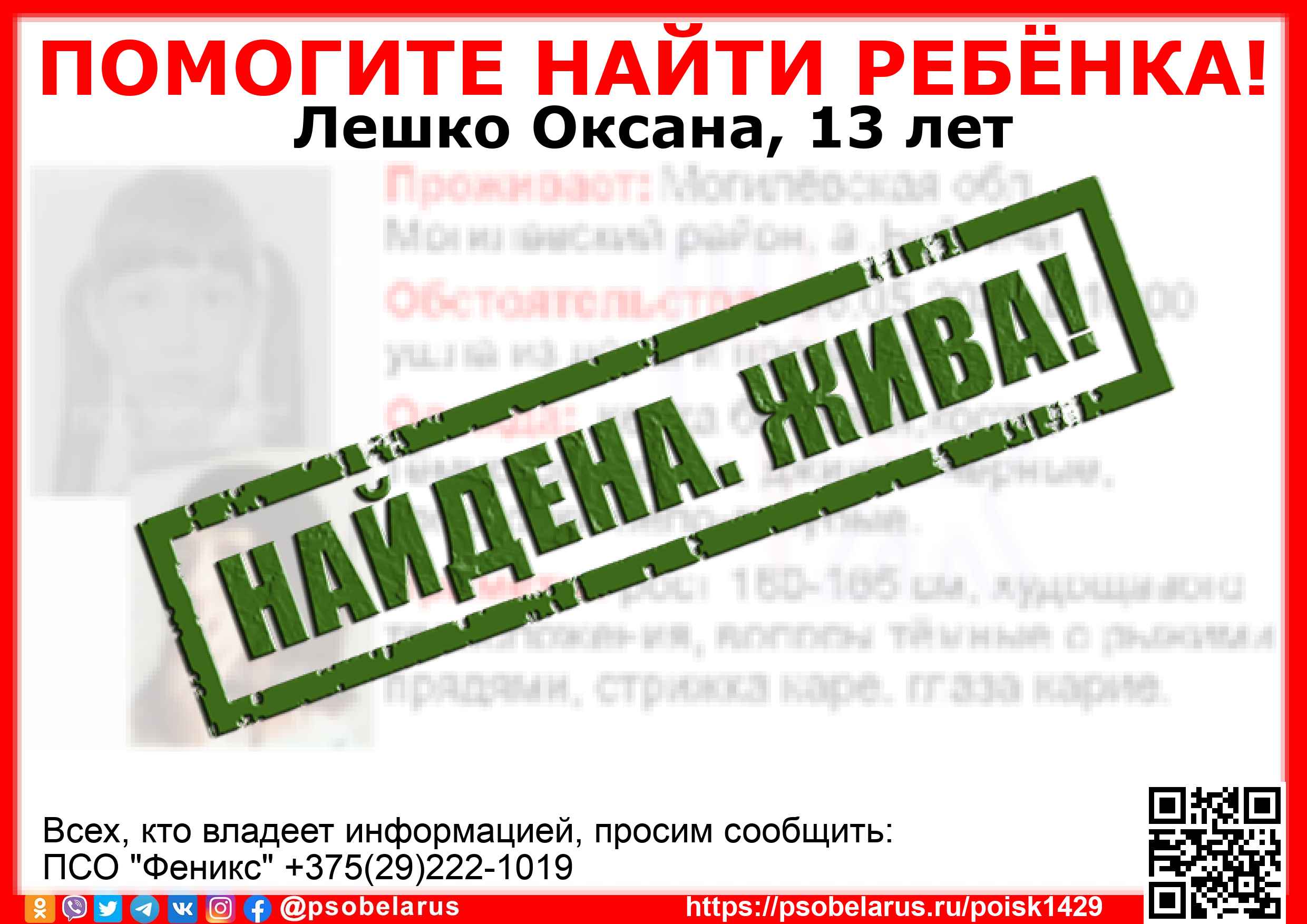 Всех, кто владеет информацией, просим сообщить: ПСО "Феникс" +375(29)222-1019 |