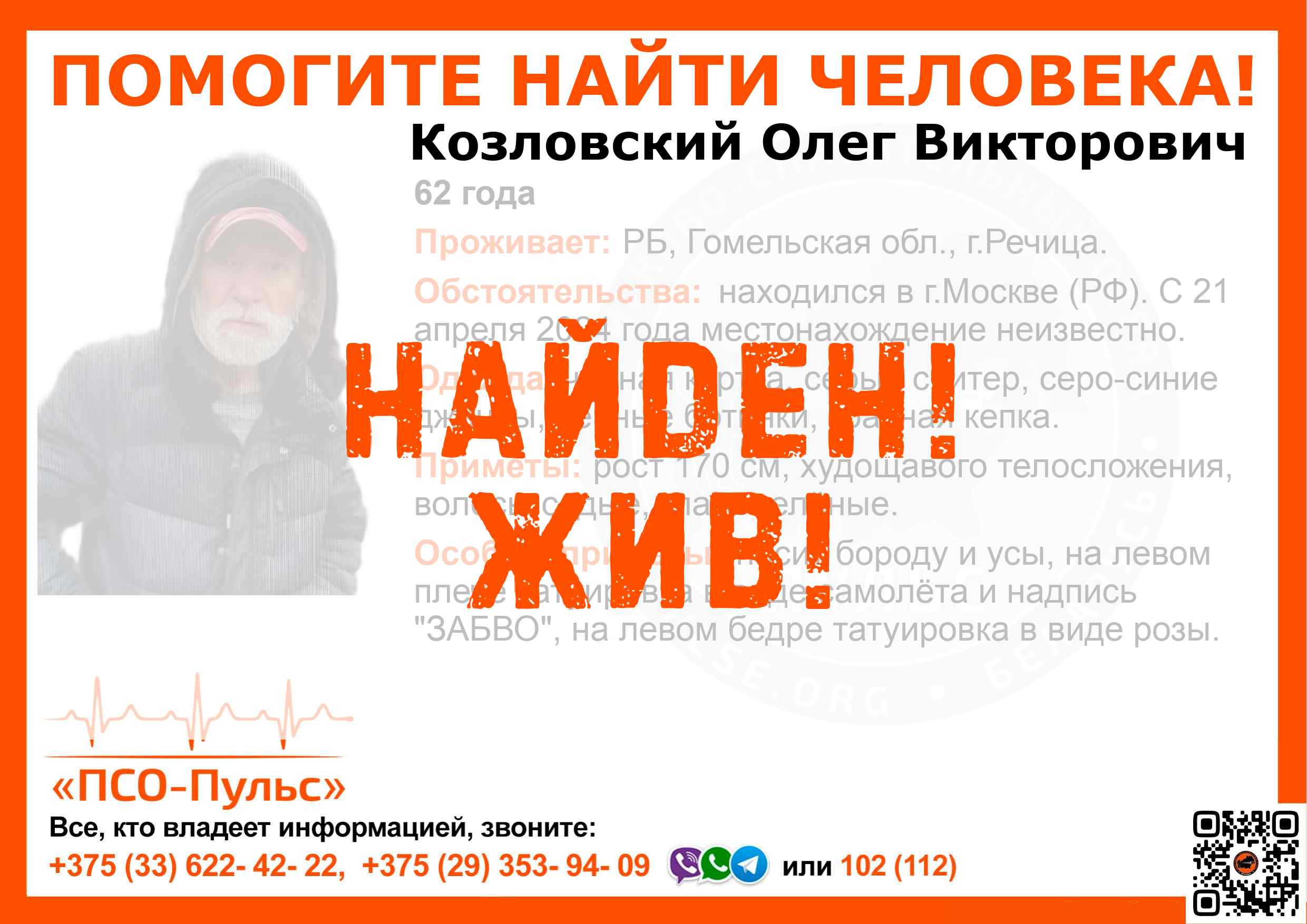 Всех, кто владеет информацией, просим сообщить: ПСО "ПСО-Пульс" +375(33)622-4222 |