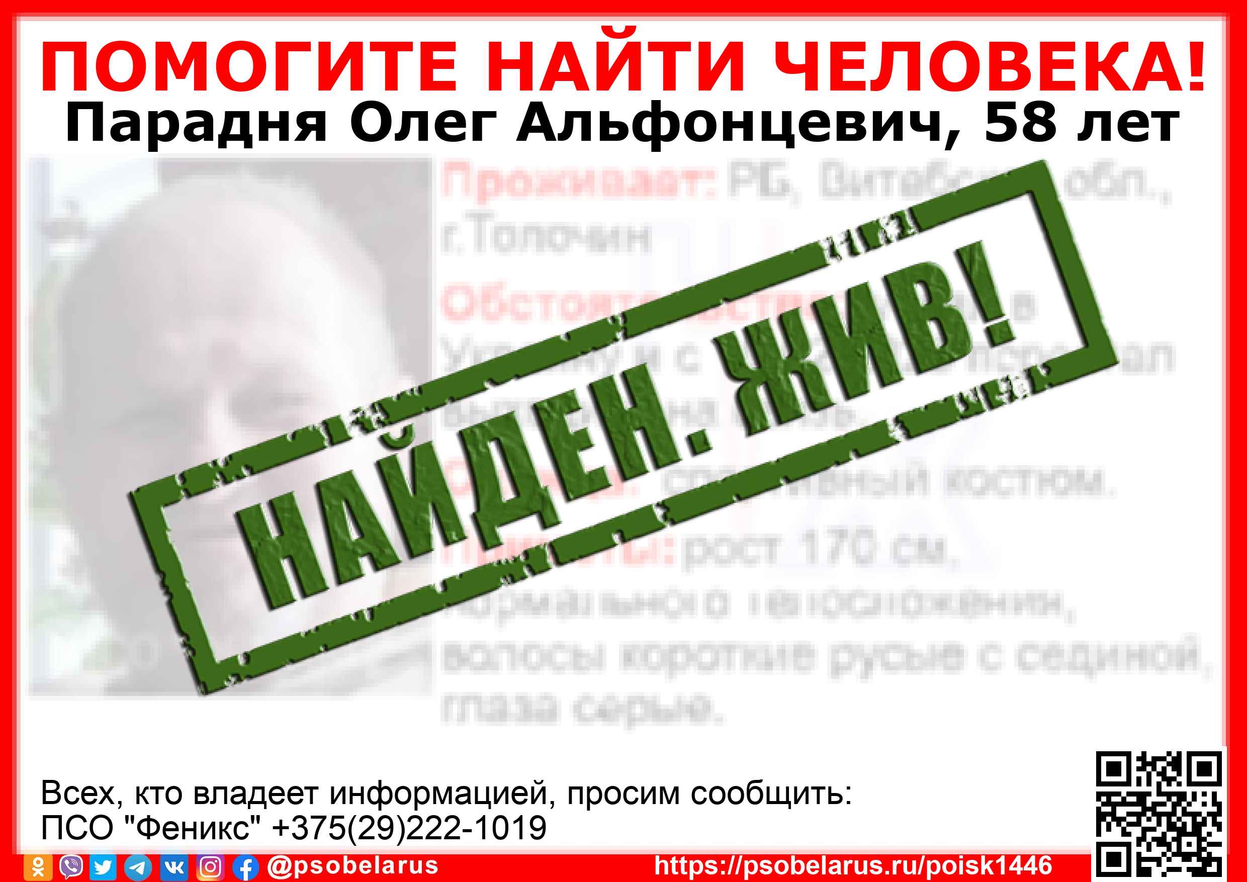 Всех, кто владеет информацией, просим сообщить: ПСО "Феникс" +375(29)222-1019 |
