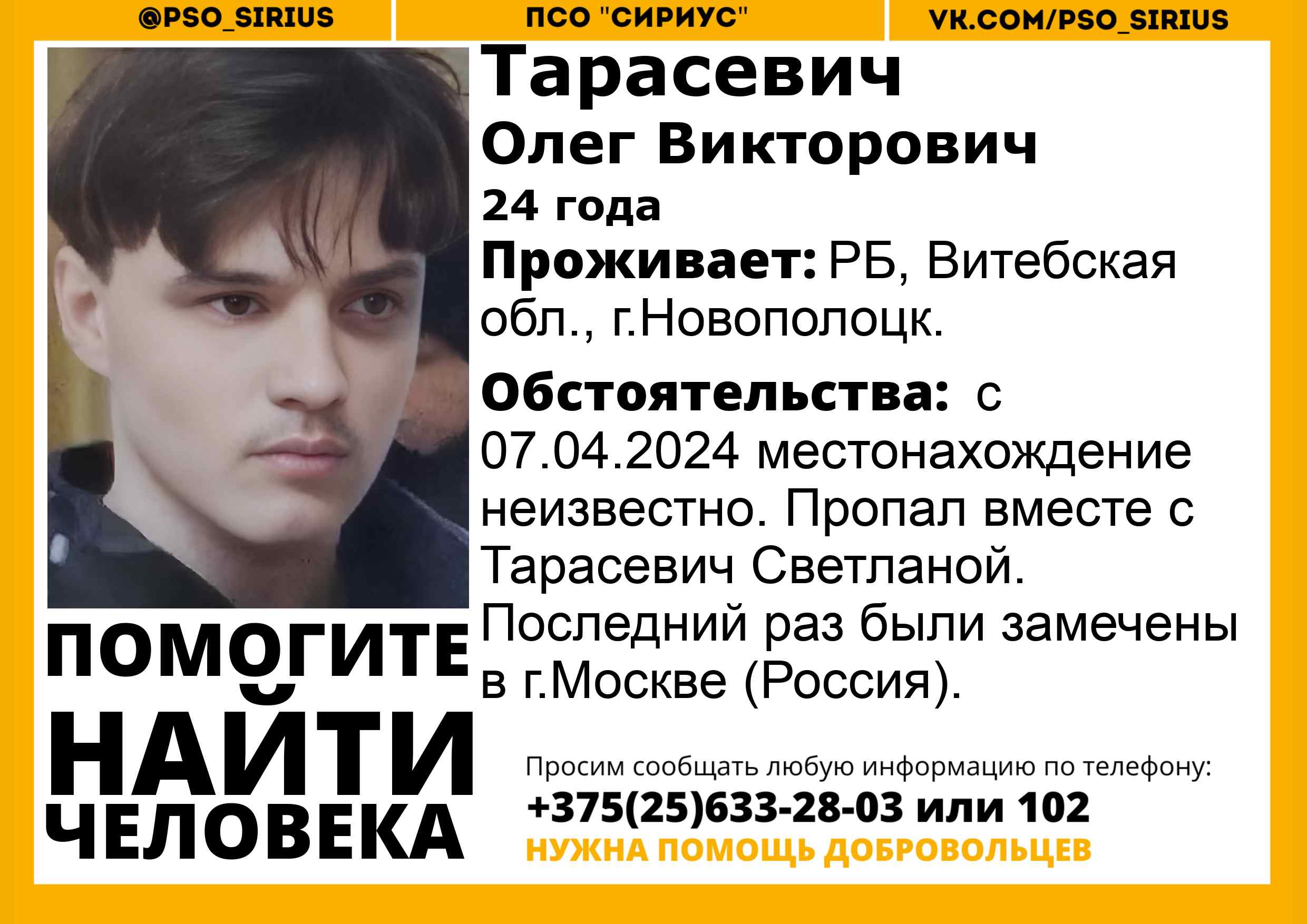 Всех, кто владеет информацией, просим сообщить: ПСО "Сириус" +375(25)633-28-03 |