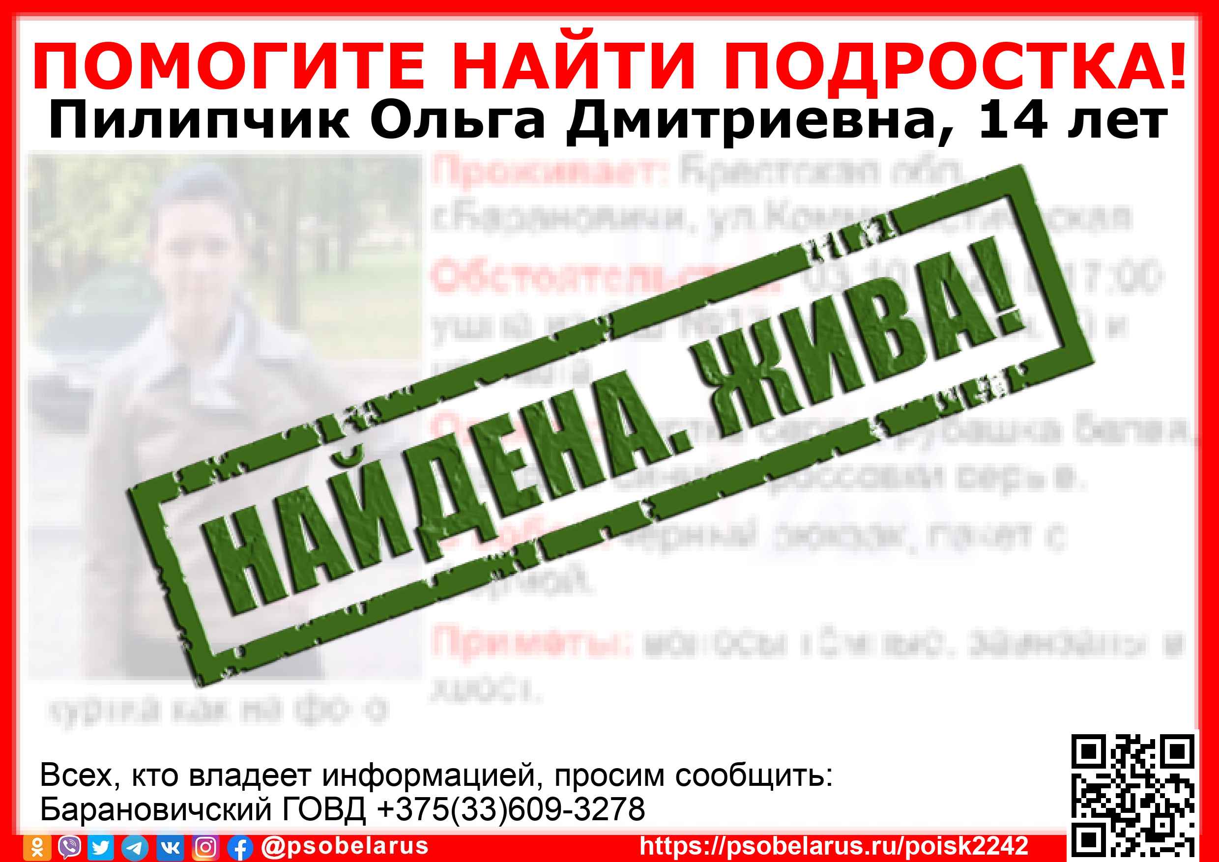 Всех, кто владеет информацией, просим сообщить: Барановичский ГОВД +375(33)609-3278 |