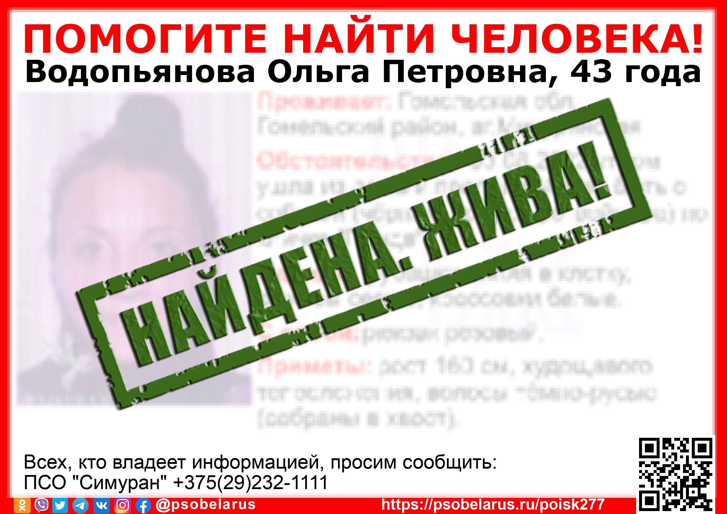 Всех, кто владеет информацией, просим сообщить: ПСО "Симуран" +375(29)232-1111 |