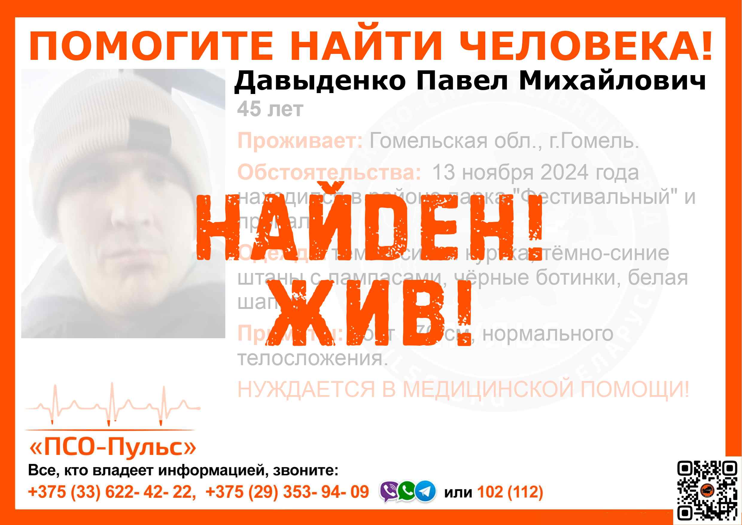 Всех, кто владеет информацией, просим сообщить: ПСО "ПСО-Пульс" +375(33)622-4222 |