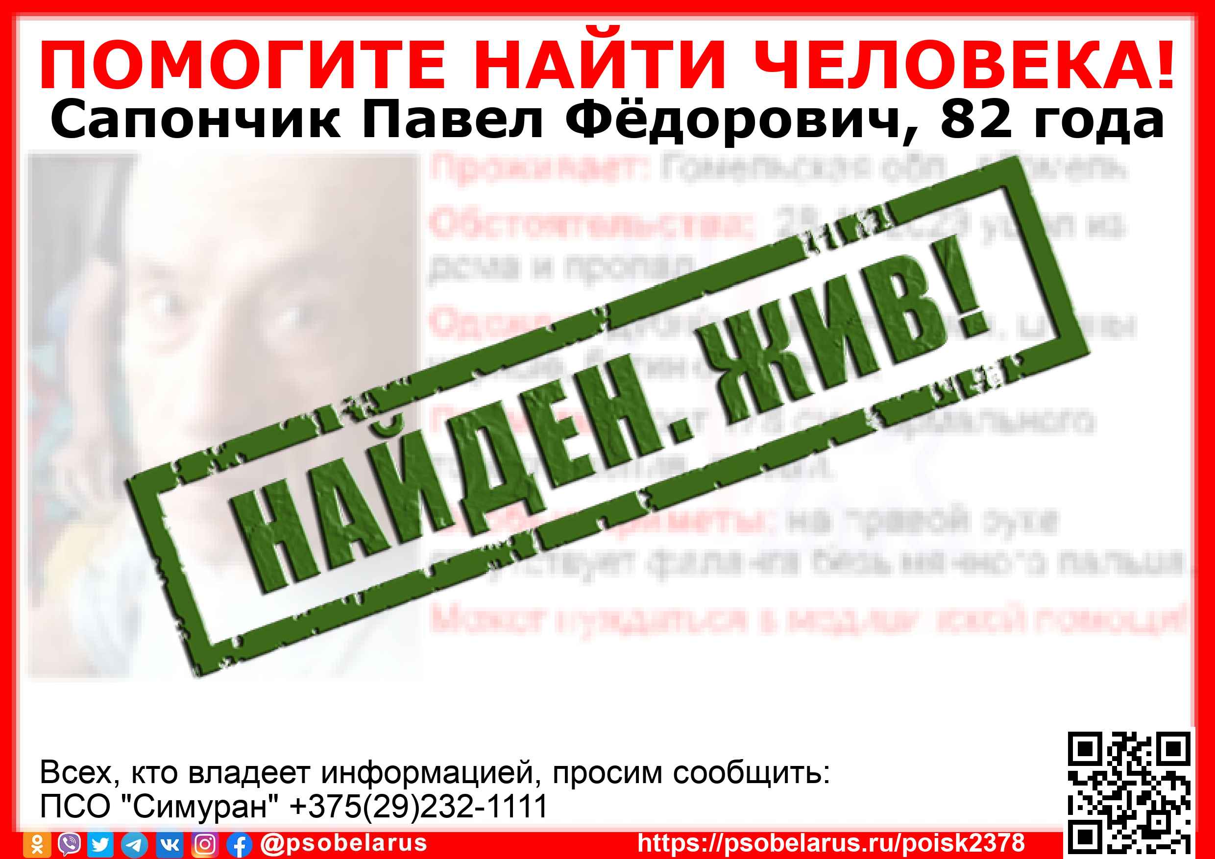 Всех, кто владеет информацией, просим сообщить: ПСО "Симуран" +375(29)232-1111 |
