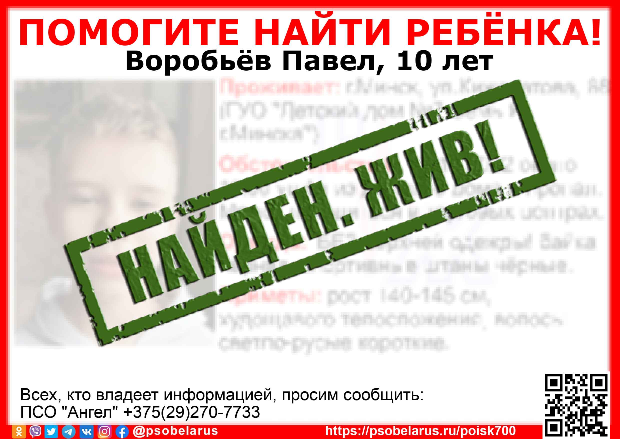 Всех, кто владеет информацией, просим сообщить: ПСО "Ангел" +375(29)270-7733 |