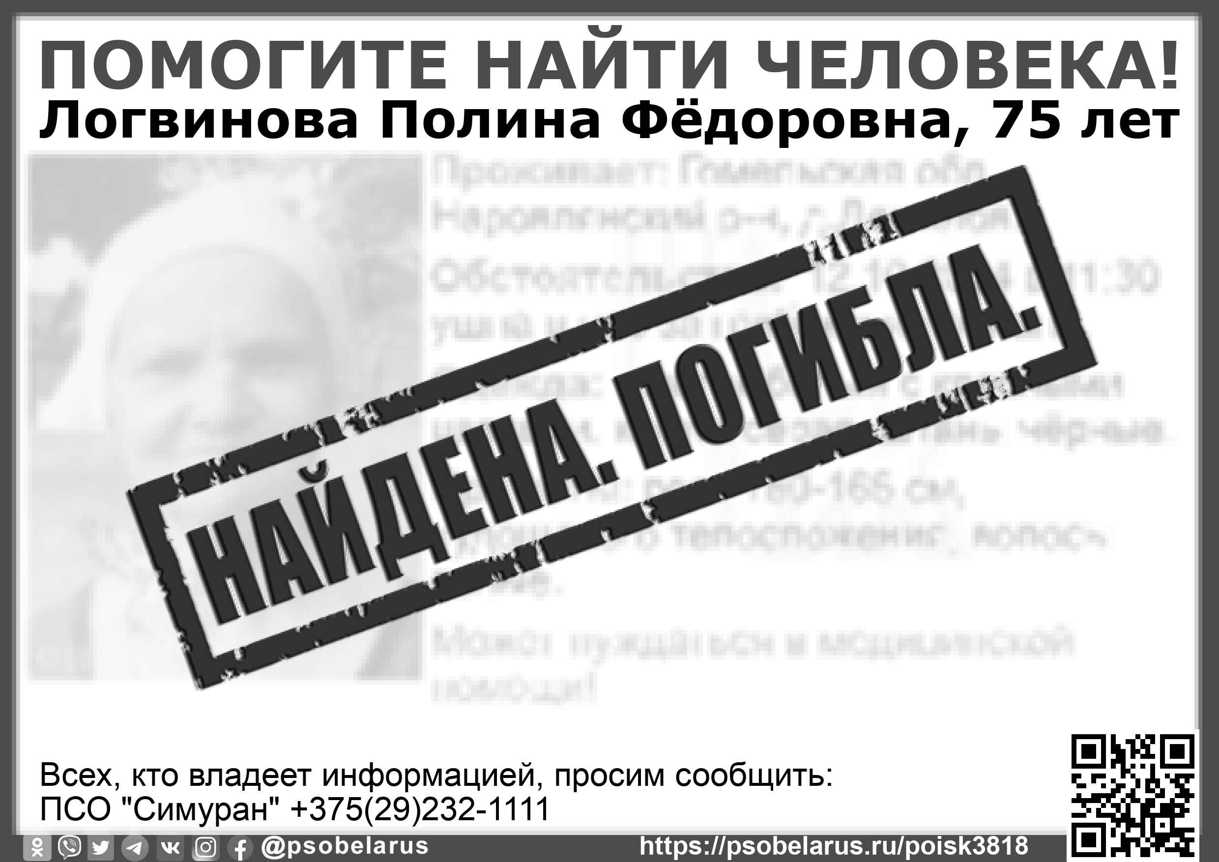 | Всех, кто владеет информацией, просим сообщить: ПСО "Симуран" +375(29)232-1111 |  |