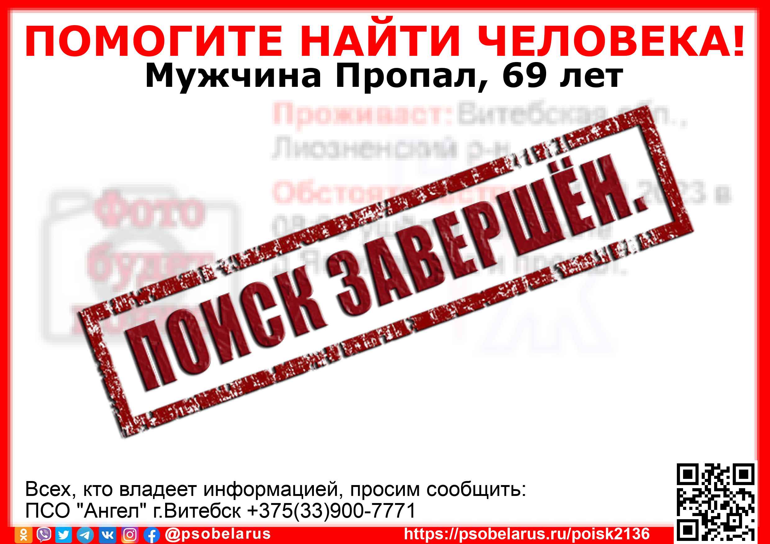 Всех, кто владеет информацией, просим сообщить: ПСО "Ангел" г.Витебск +375(33)900-7771 |