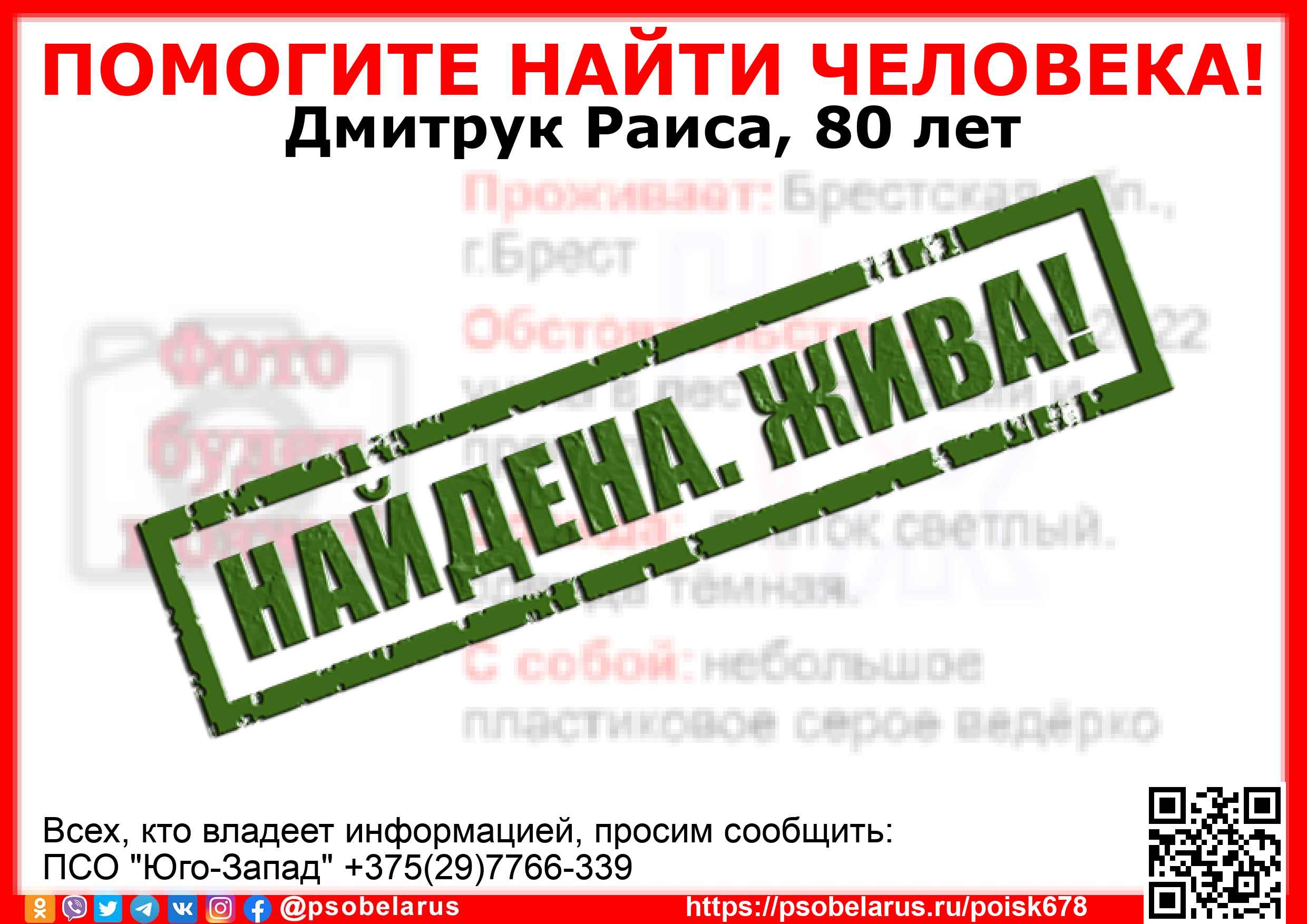 Всех, кто владеет информацией, просим сообщить: ПСО "Юго-Запад" +375(29)7766-339 |