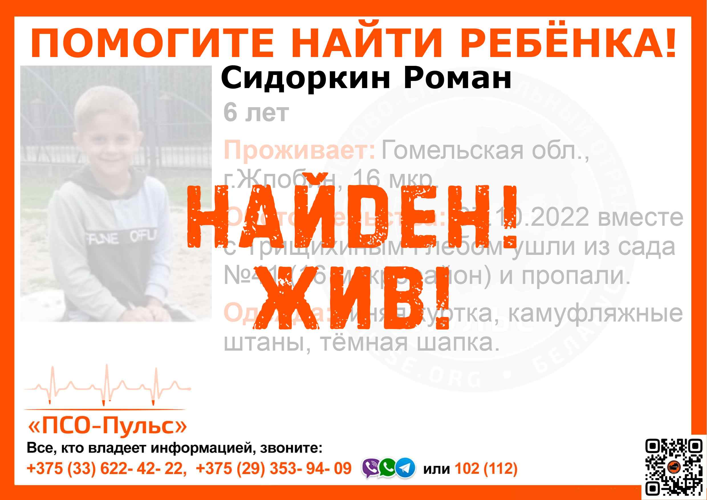 Всех, кто владеет информацией, просим сообщить: ПСО "ПСО-Пульс" +375(33)622-4222 |
