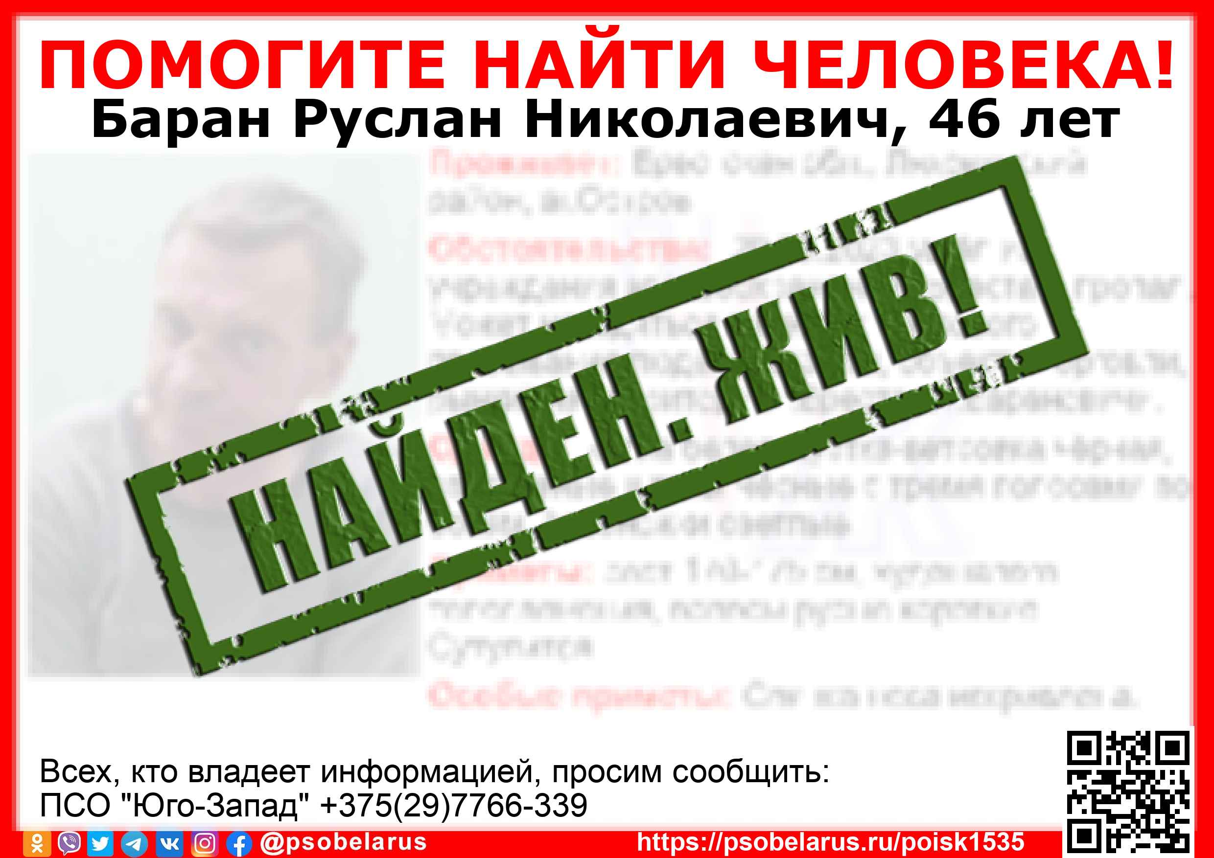 Всех, кто владеет информацией, просим сообщить: ПСО "Юго-Запад" +375(29)7766-339 |