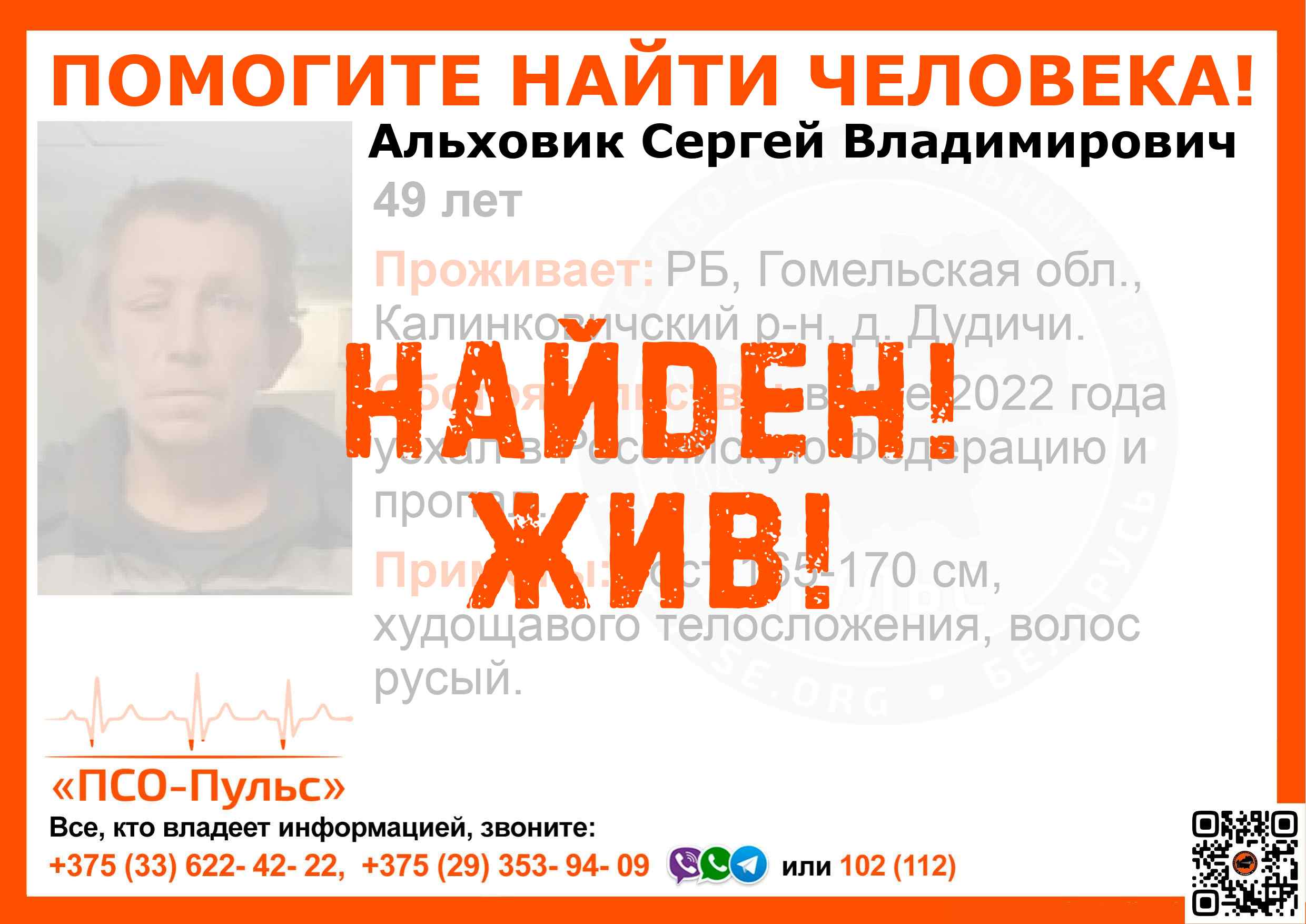 Всех, кто владеет информацией, просим сообщить: ПСО "ПСО-Пульс" +375(33)622-4222 |