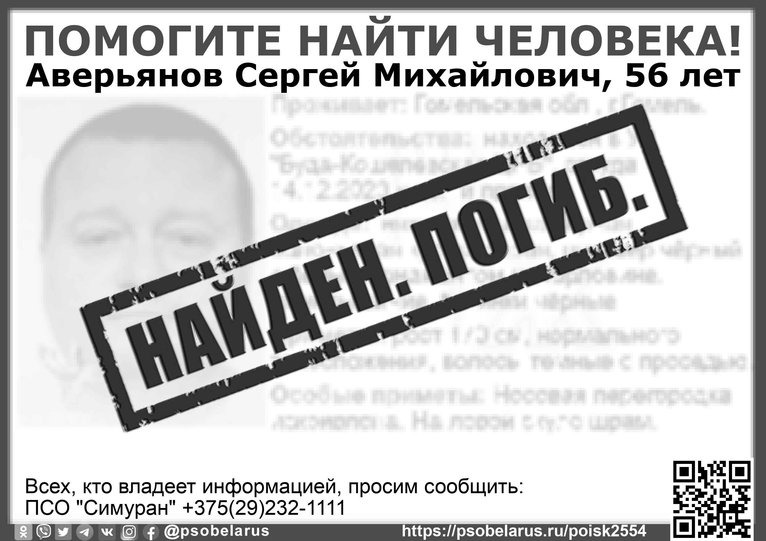Всех, кто владеет информацией, просим сообщить: ПСО "Симуран" +375(29)232-1111 |