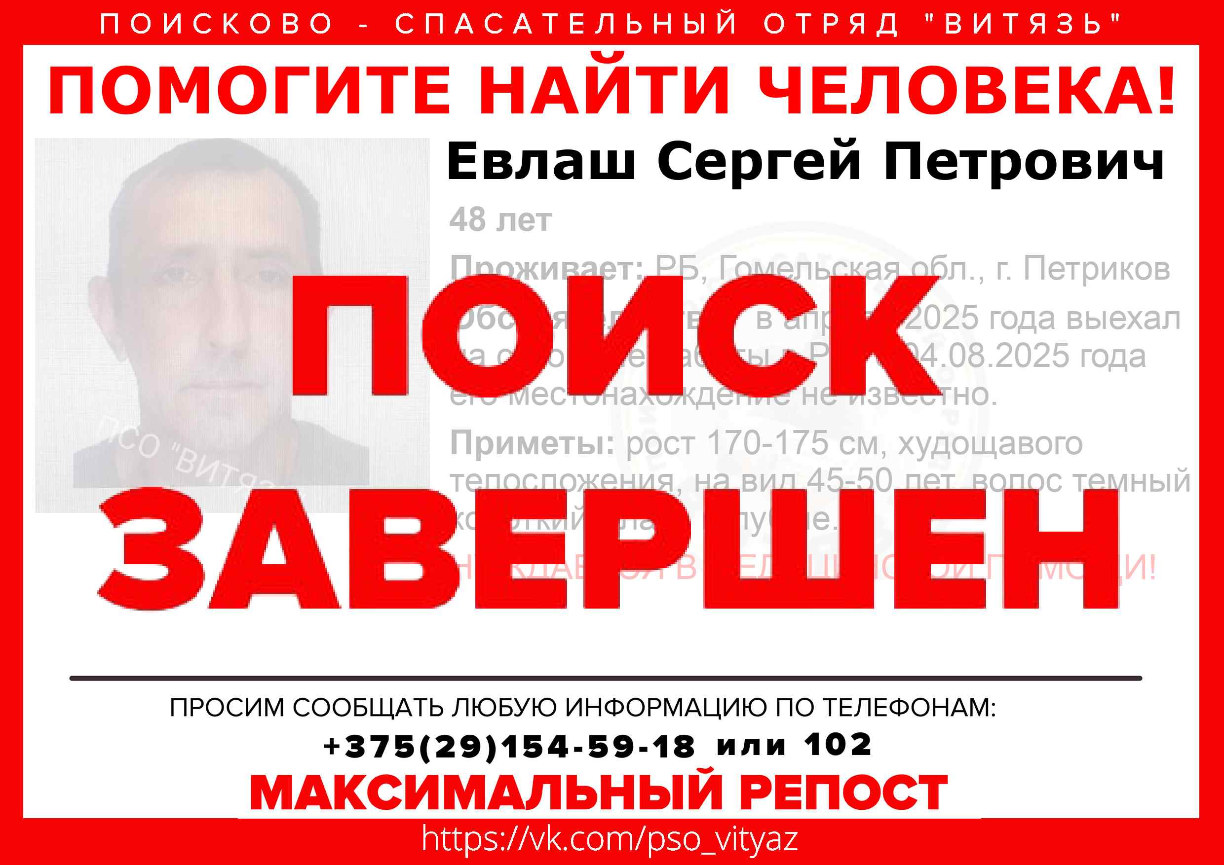 Всех, кто владеет информацией, просим сообщить: ПСО "ВИТЯЗЬ" +375(29)154-59-18 |