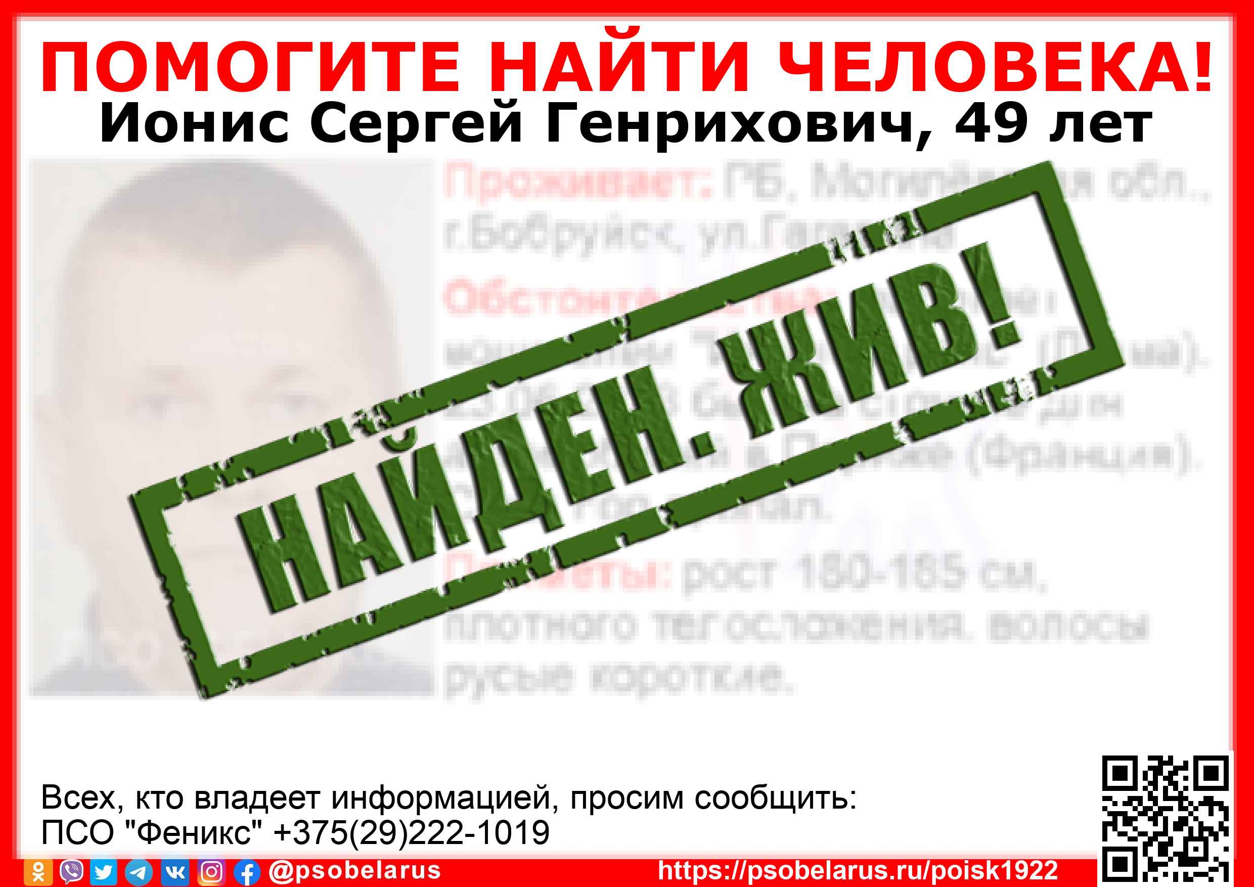 Всех, кто владеет информацией, просим сообщить: ПСО "Феникс" +375(29)222-1019 |