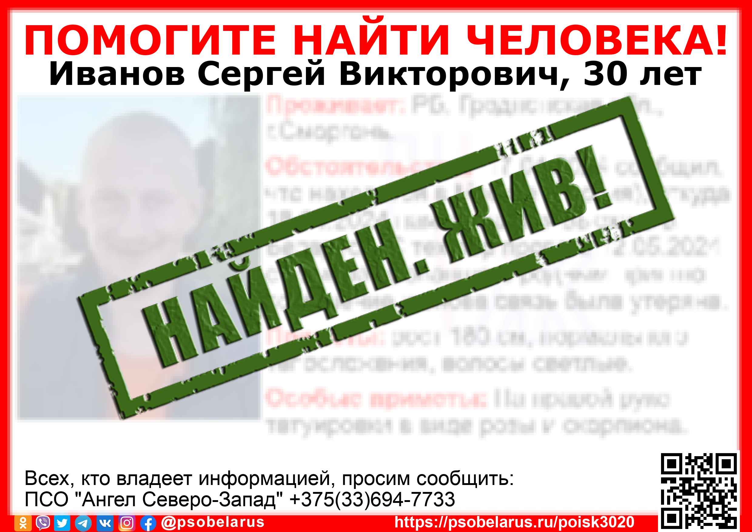 Всех, кто владеет информацией, просим сообщить: ПСО "Ангел Северо-Запад" +375(33)694-7733 |