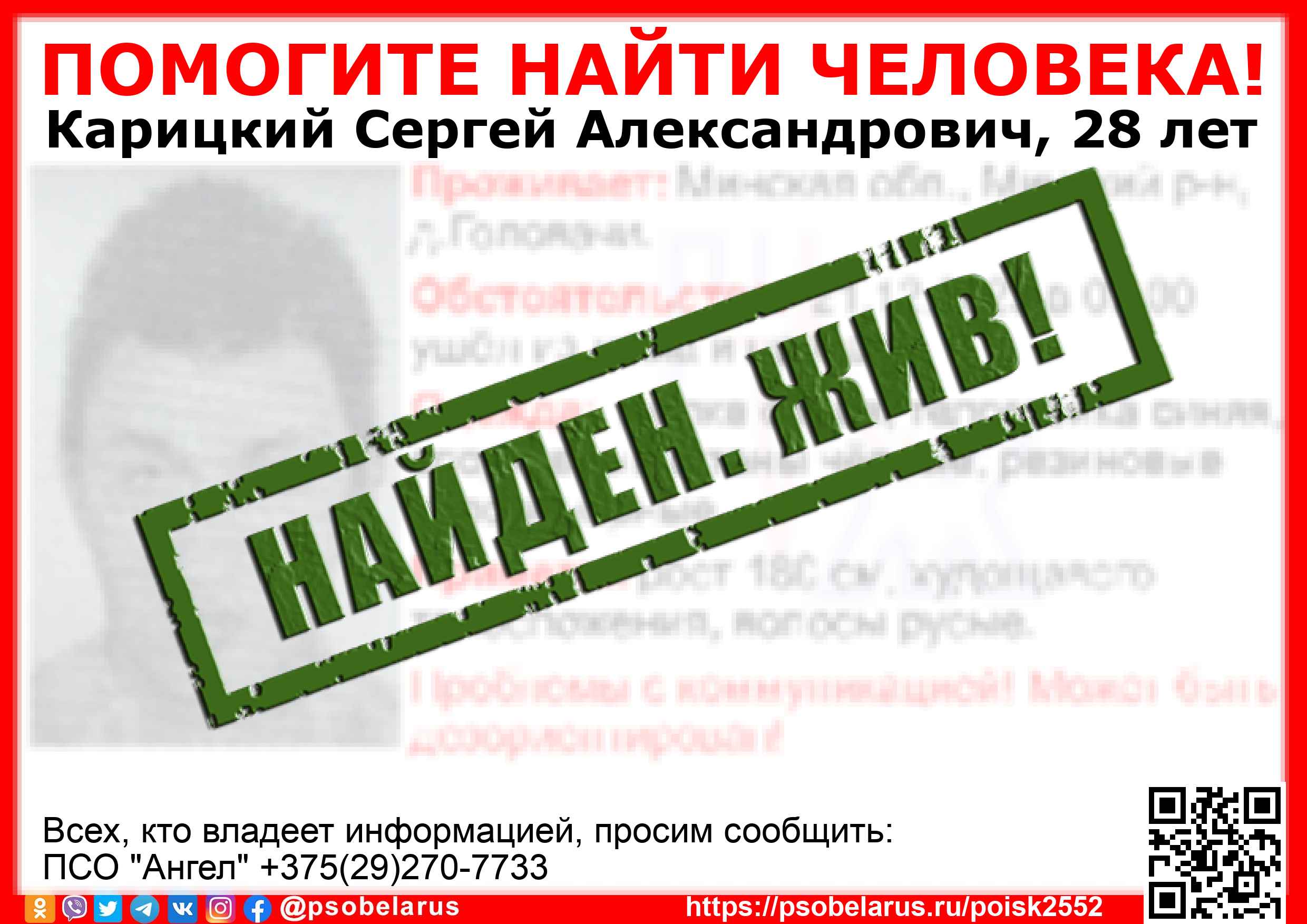 Всех, кто владеет информацией, просим сообщить: ПСО "Ангел" +375(29)270-7733 |