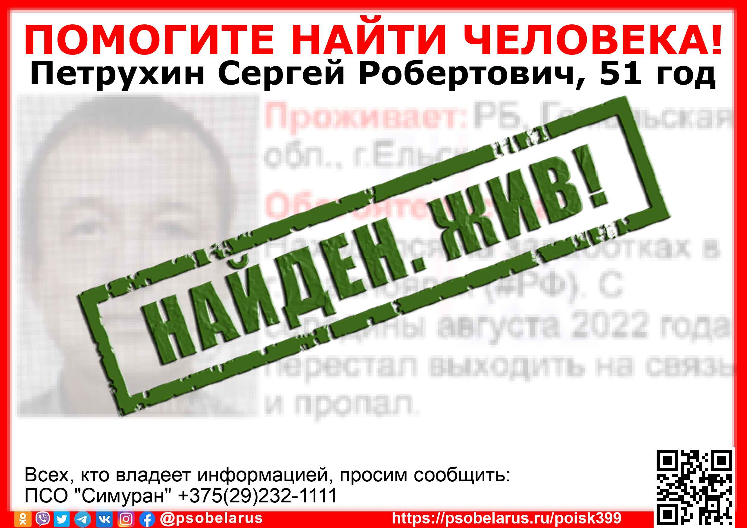 | Всех, кто владеет информацией, просим сообщить: ПСО "Симуран" +375(29)232-1111 |  |