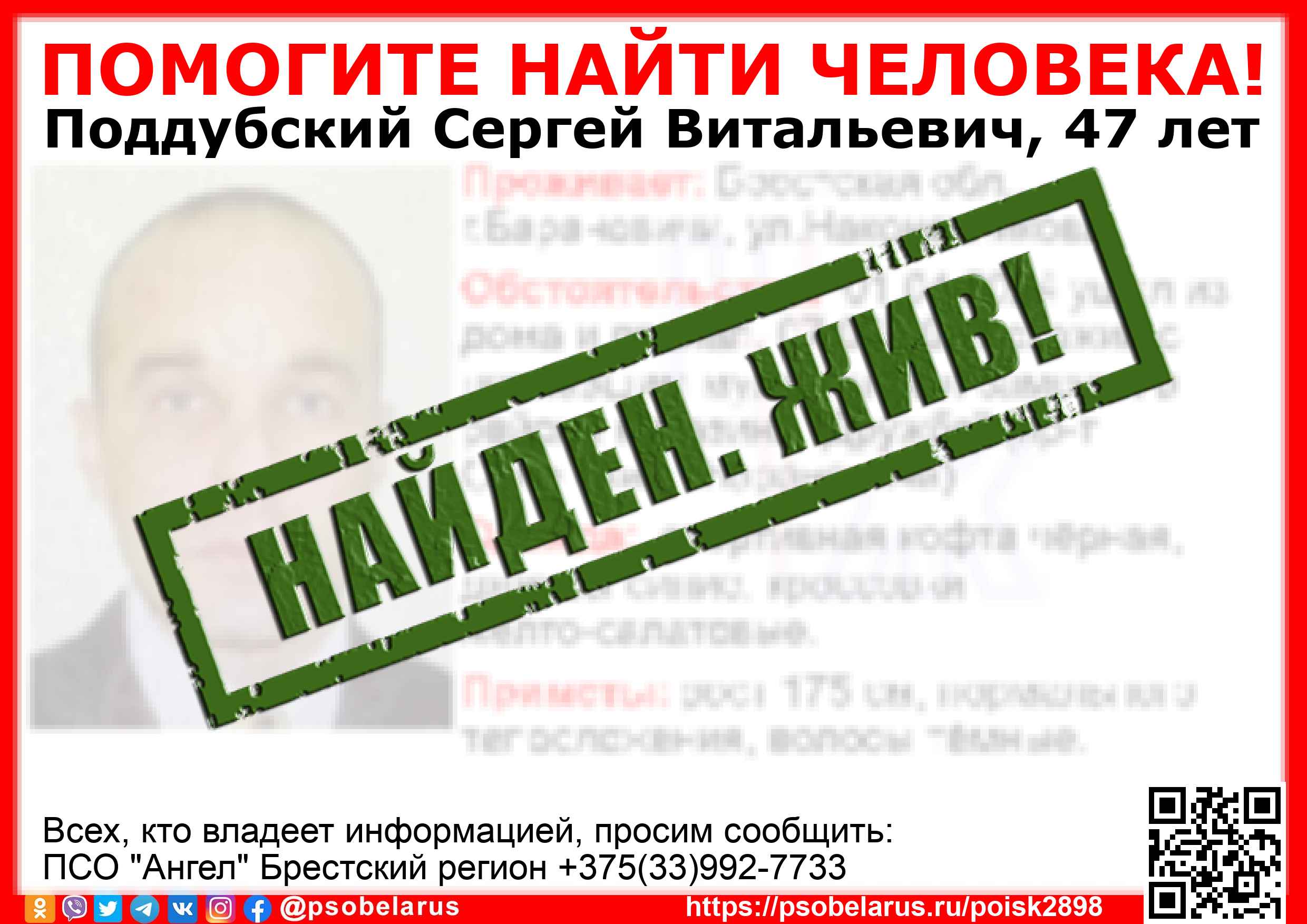 Всех, кто владеет информацией, просим сообщить: ПСО "Ангел" Брестский регион +375(33)992-7733 |