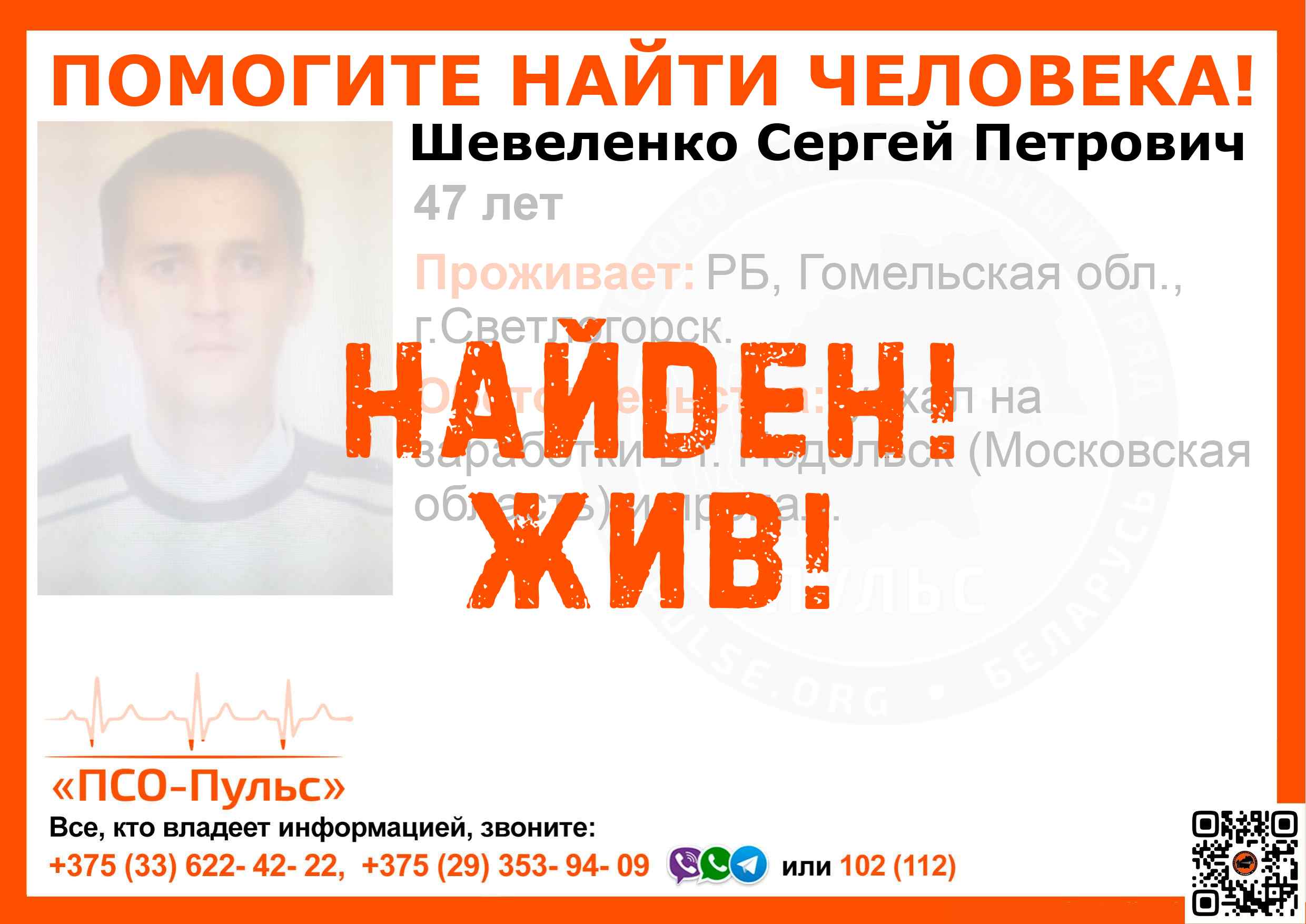 Всех, кто владеет информацией, просим сообщить: ПСО "ПСО-Пульс" +375(33)622-4222 |