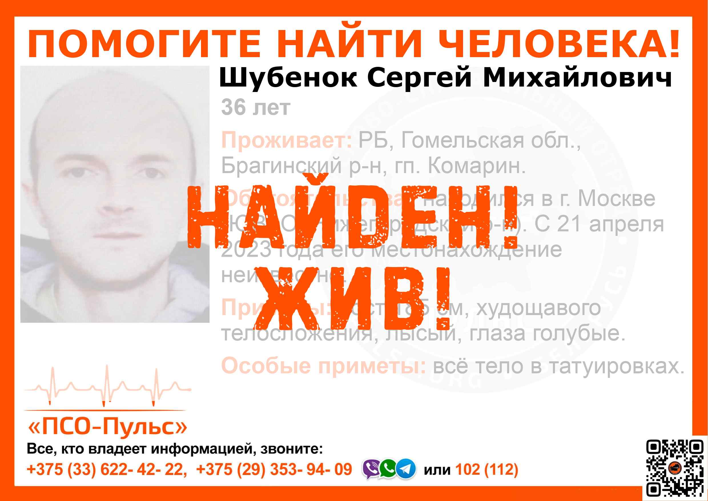 Всех, кто владеет информацией, просим сообщить: ПСО "ПСО-Пульс" +375(33)622-4222 |