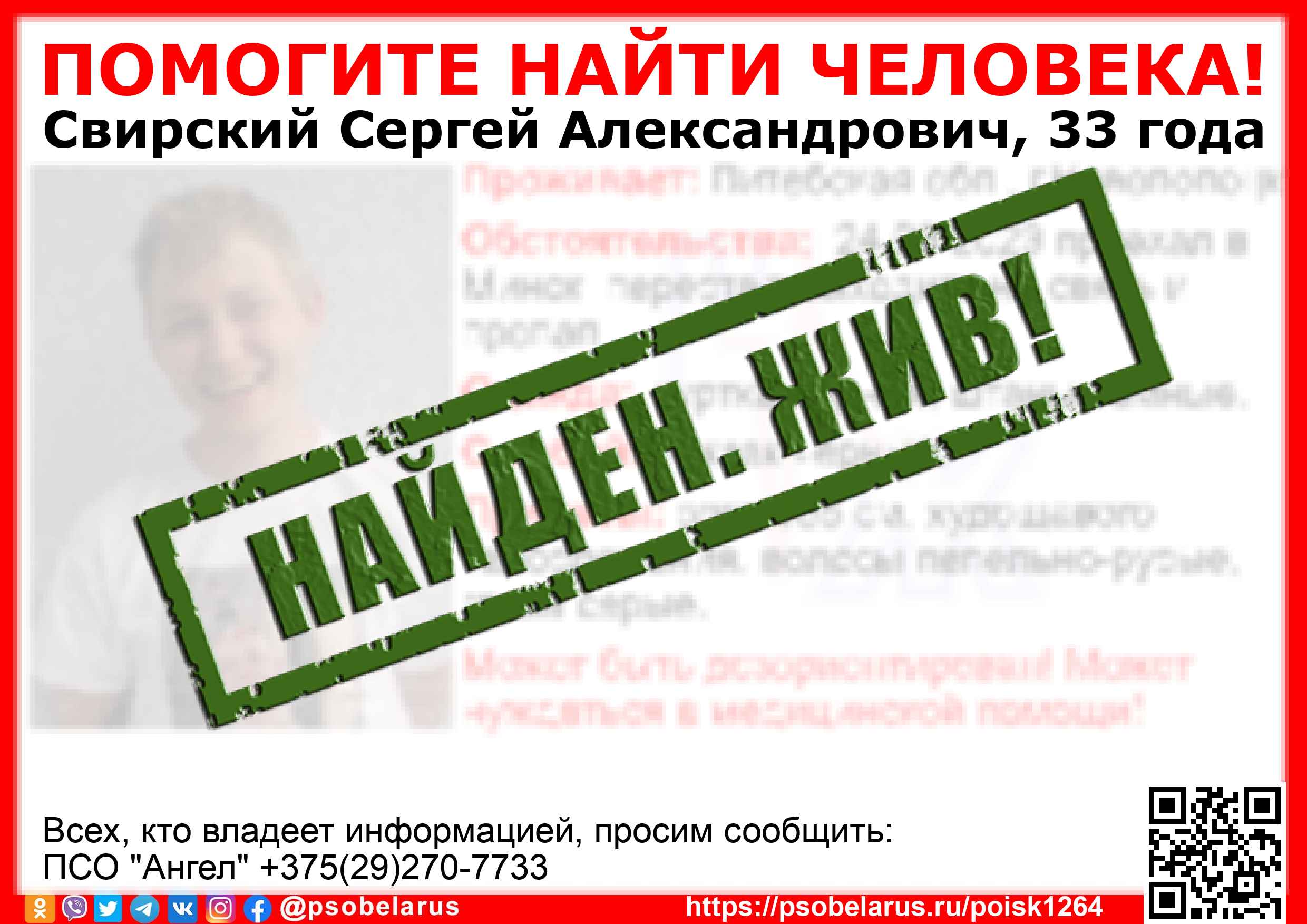 Всех, кто владеет информацией, просим сообщить: ПСО "Ангел" +375(29)270-7733 |