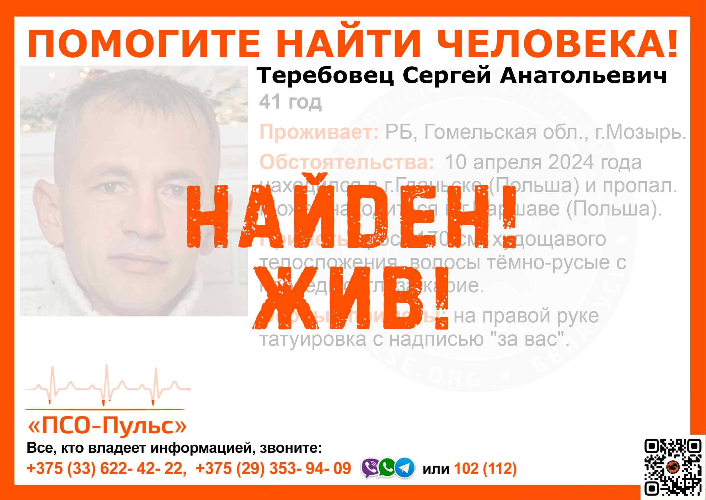 Всех, кто владеет информацией, просим сообщить: ПСО "ПСО-Пульс" +375(33)622-4222 |