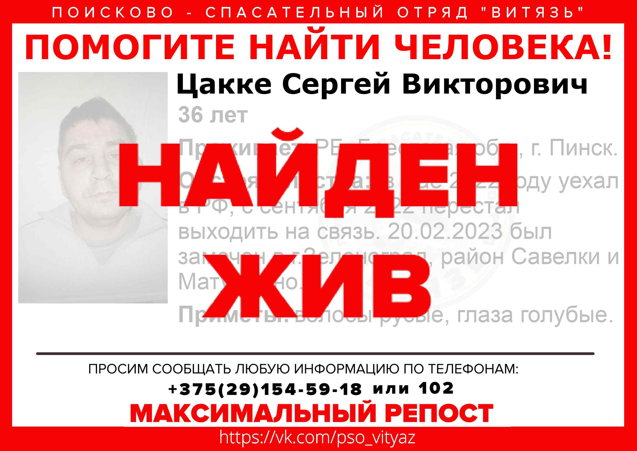 Всех, кто владеет информацией, просим сообщить: ПСО "ВИТЯЗЬ" +375(29)154-59-18 |