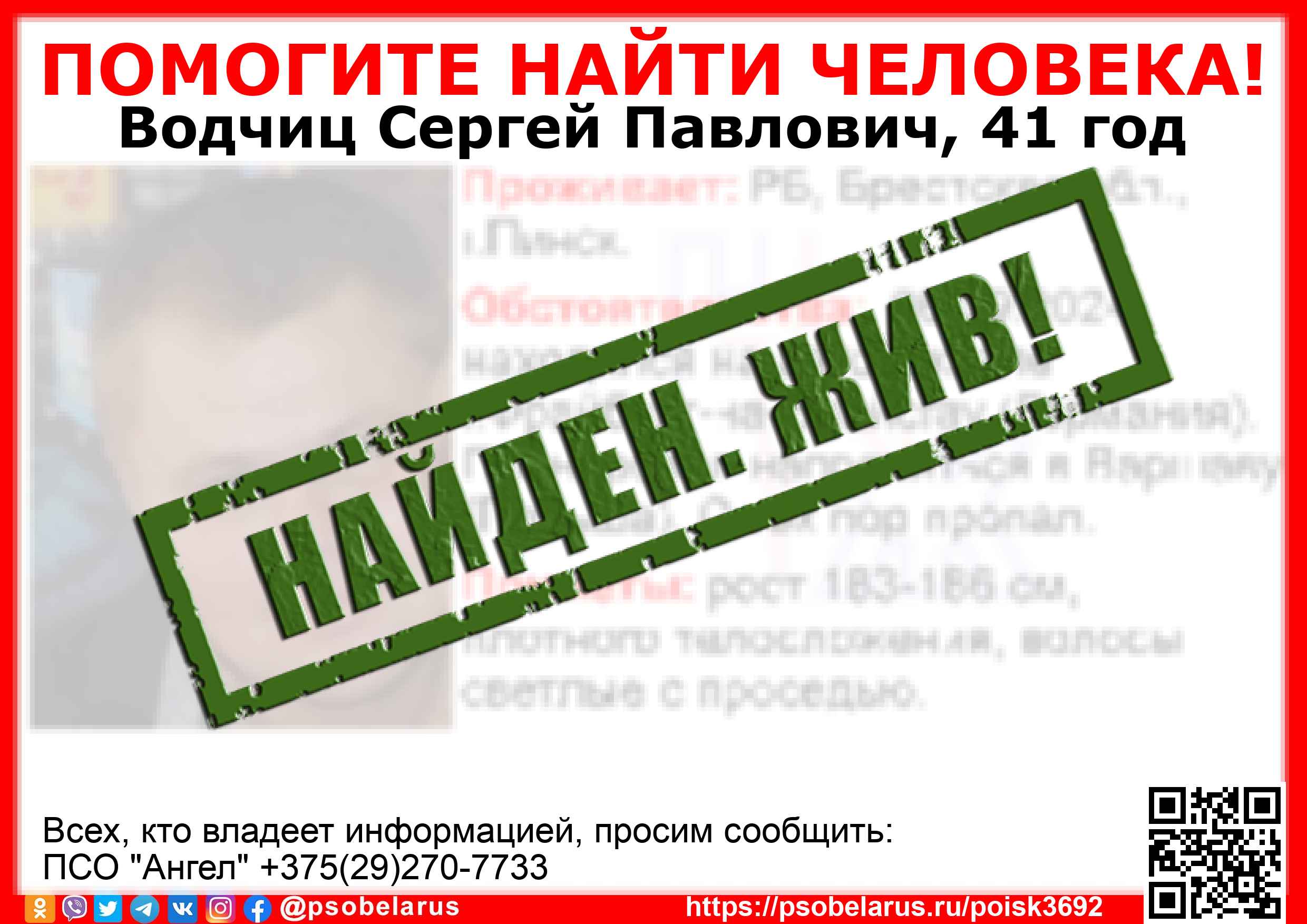 Всех, кто владеет информацией, просим сообщить: ПСО "Ангел" +375(29)270-7733 |