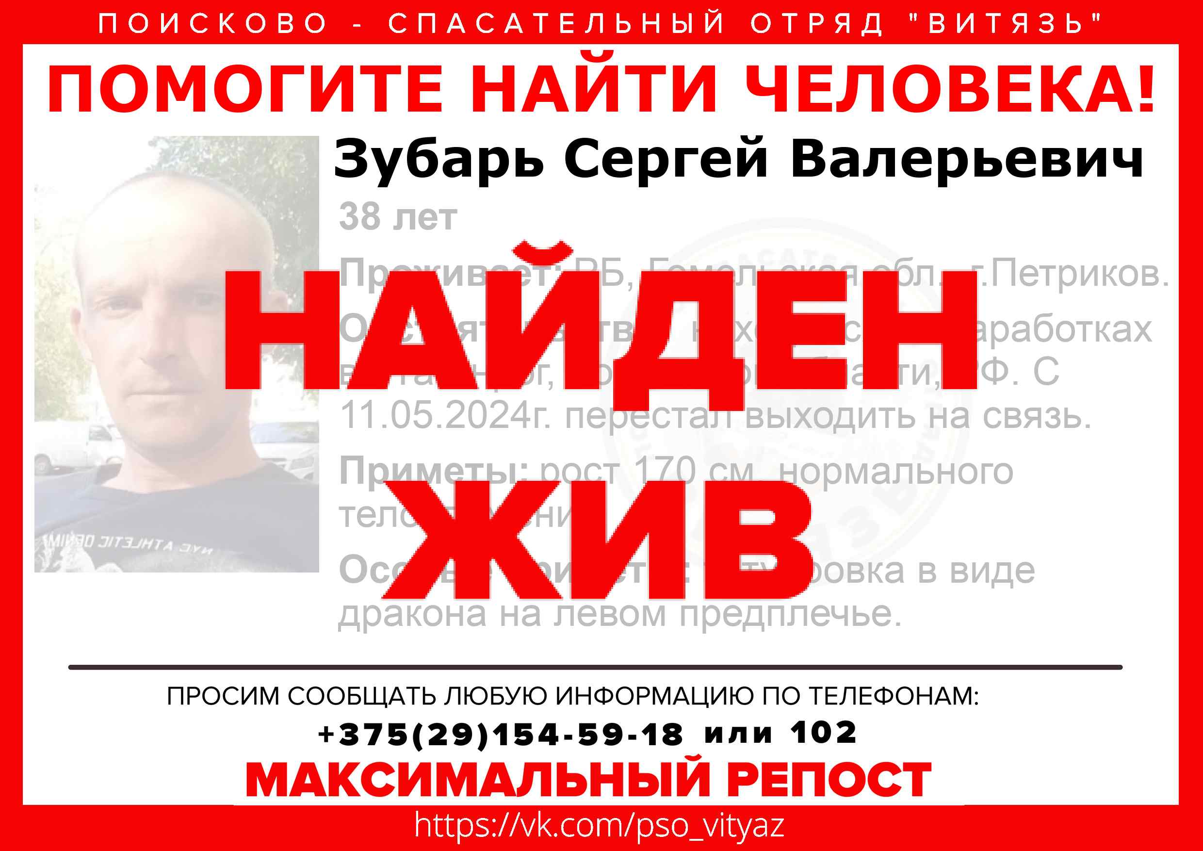 Всех, кто владеет информацией, просим сообщить: ПСО "ВИТЯЗЬ" +375(29)154-59-18 |