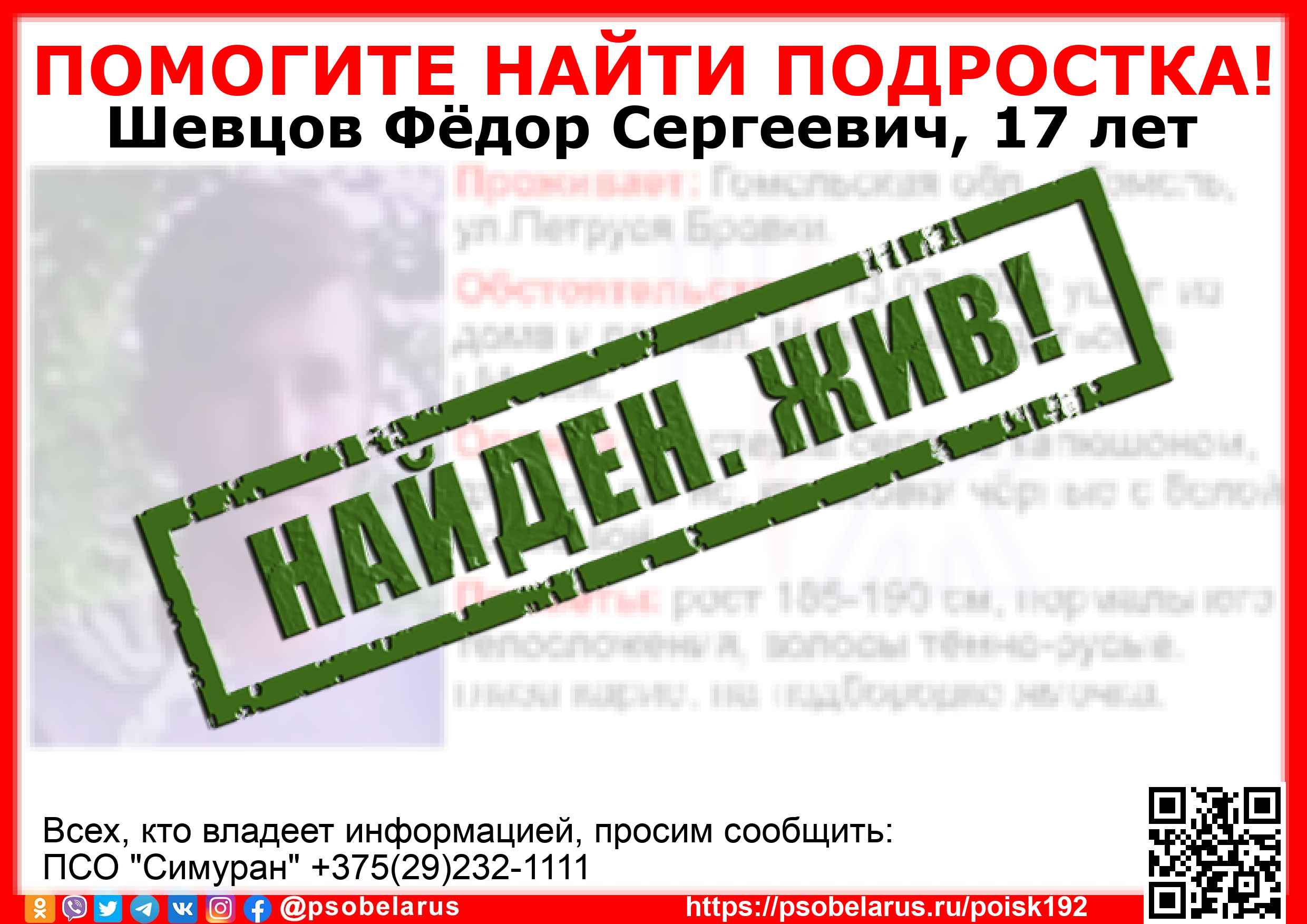 Всех, кто владеет информацией, просим сообщить: ПСО "Симуран" +375(29)232-1111 |