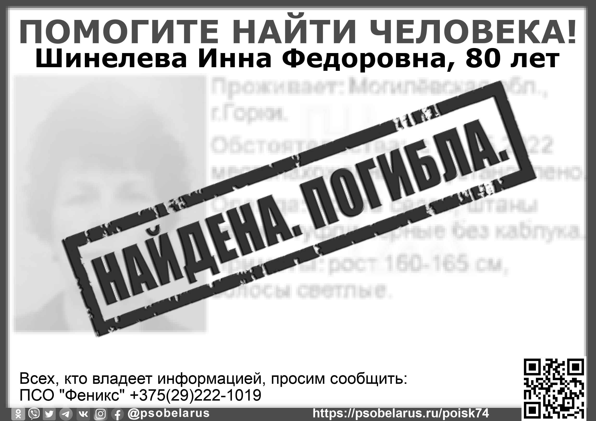 | Всех, кто владеет информацией, просим сообщить: ПСО "Феникс" +375(29)222-1019 |  |