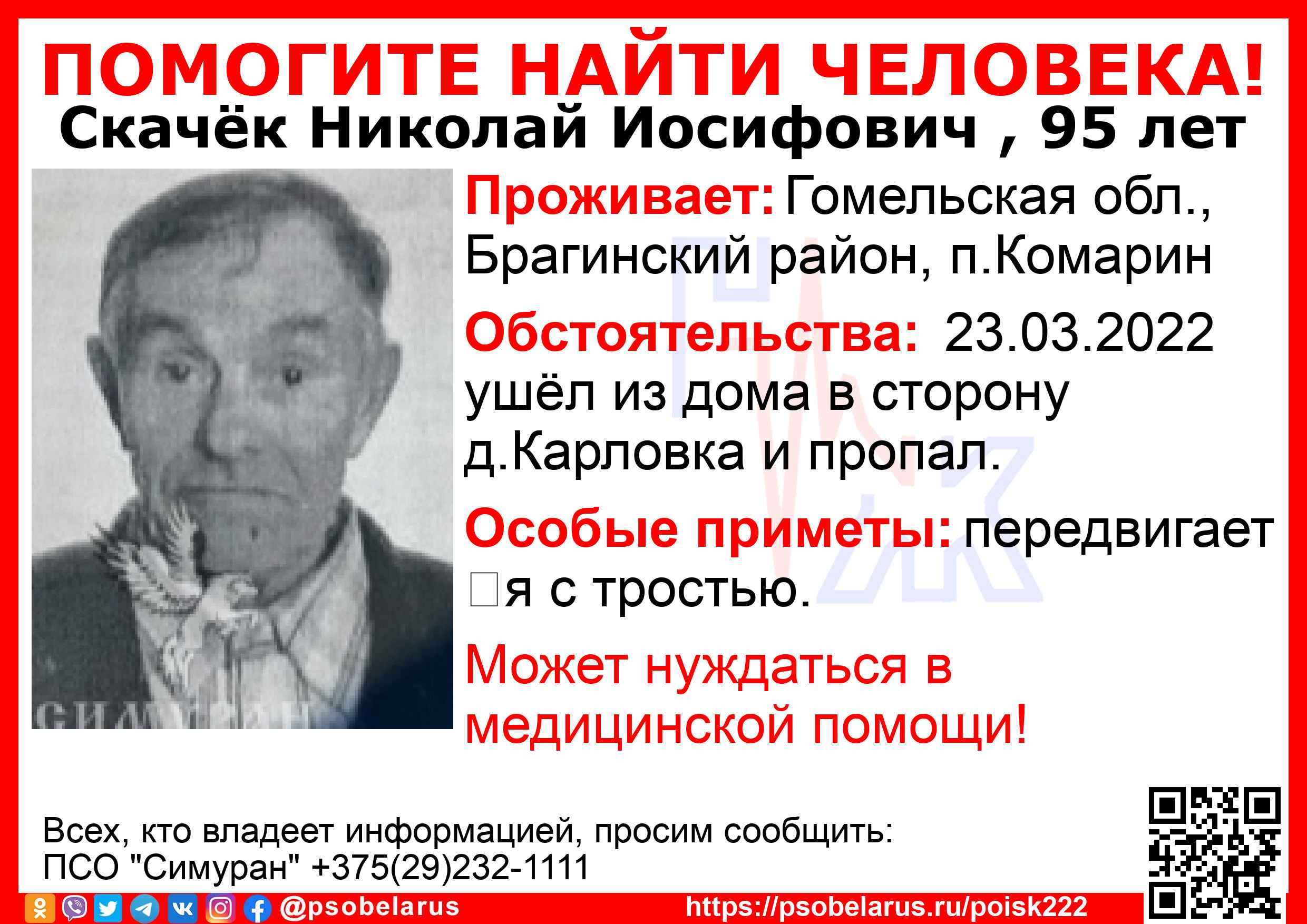Всех, кто владеет информацией, просим сообщить: ПСО "Симуран" +375(29)232-1111 |