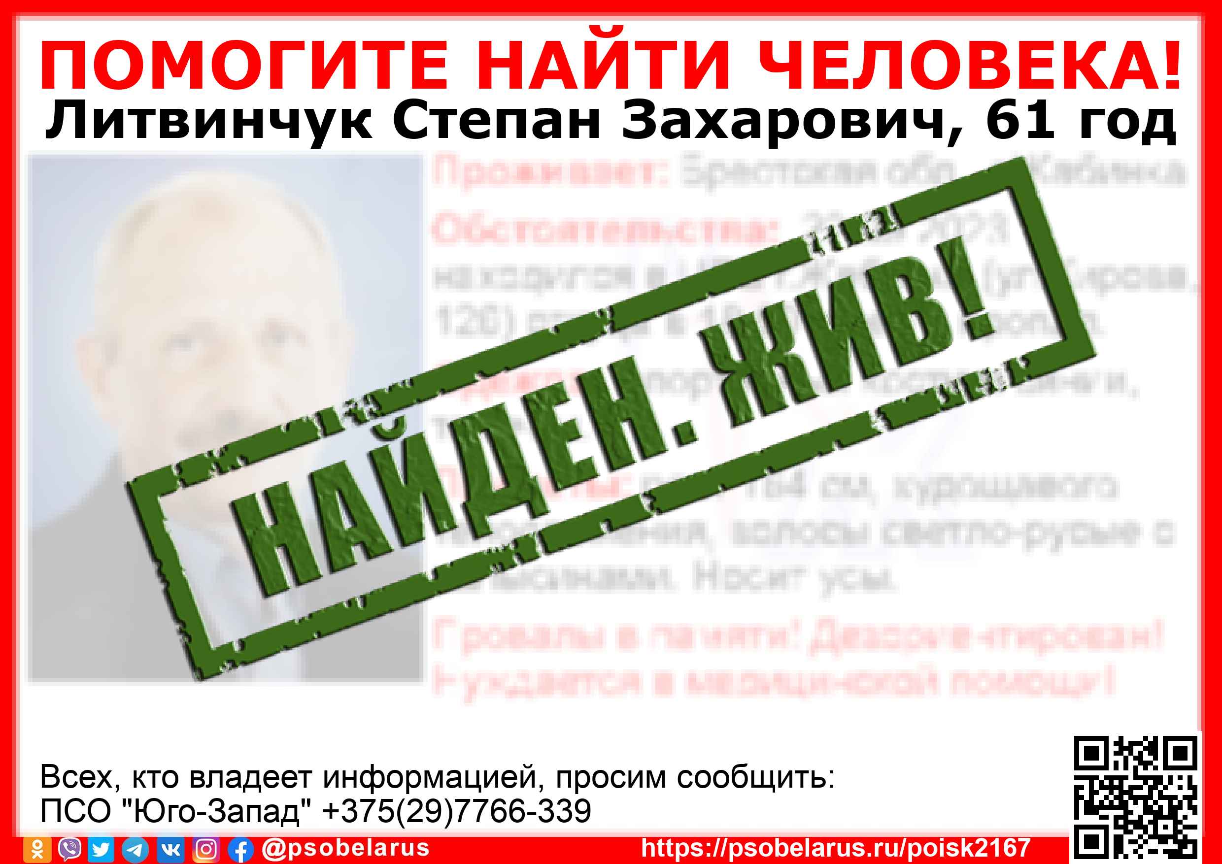 Всех, кто владеет информацией, просим сообщить: ПСО "Юго-Запад" +375(29)7766-339 |