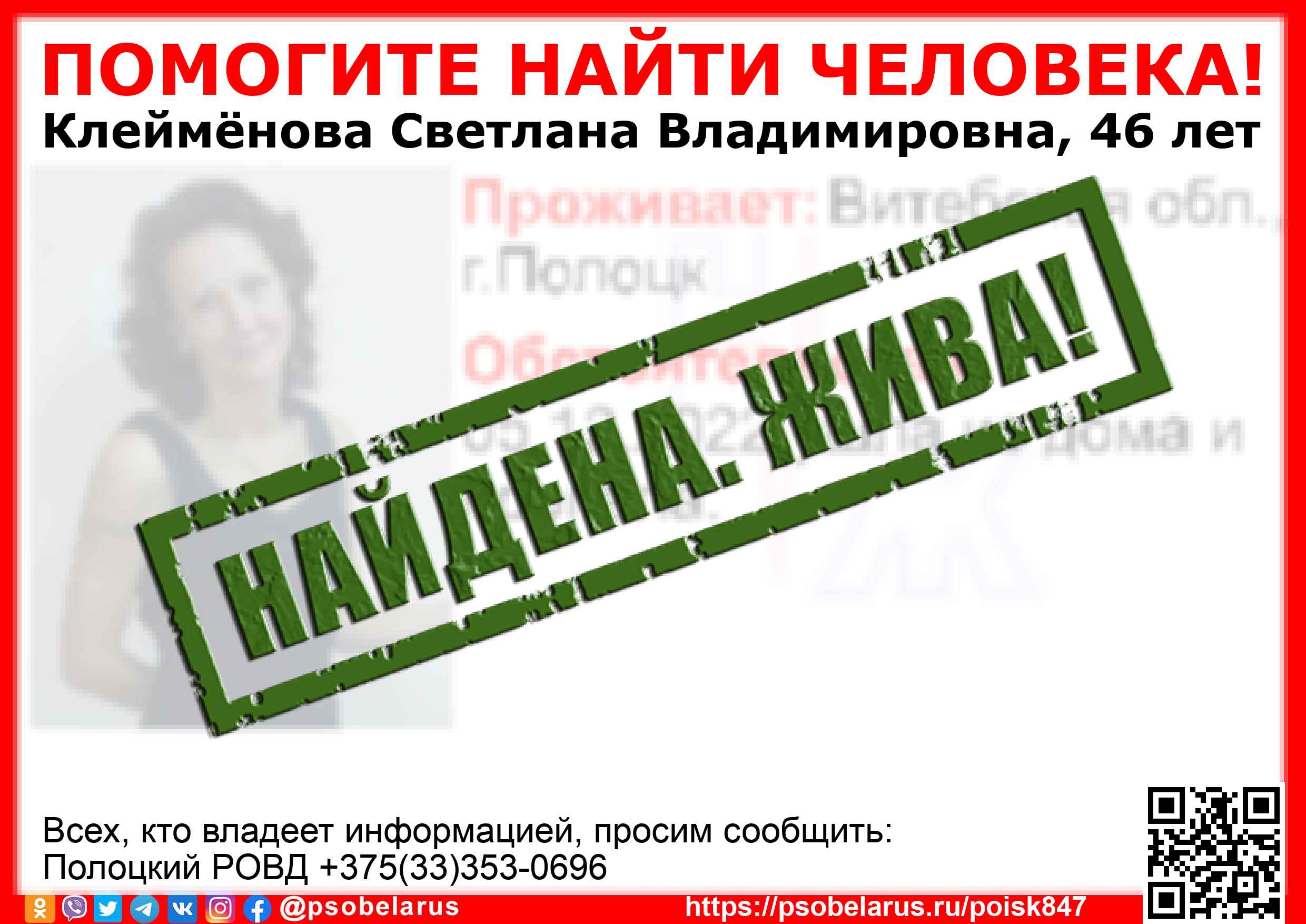 Скачать ориентировкуДля оперативного получения информации о пропавших людях и сборах на поиски можно подписаться на бота оповещения: Телеграм