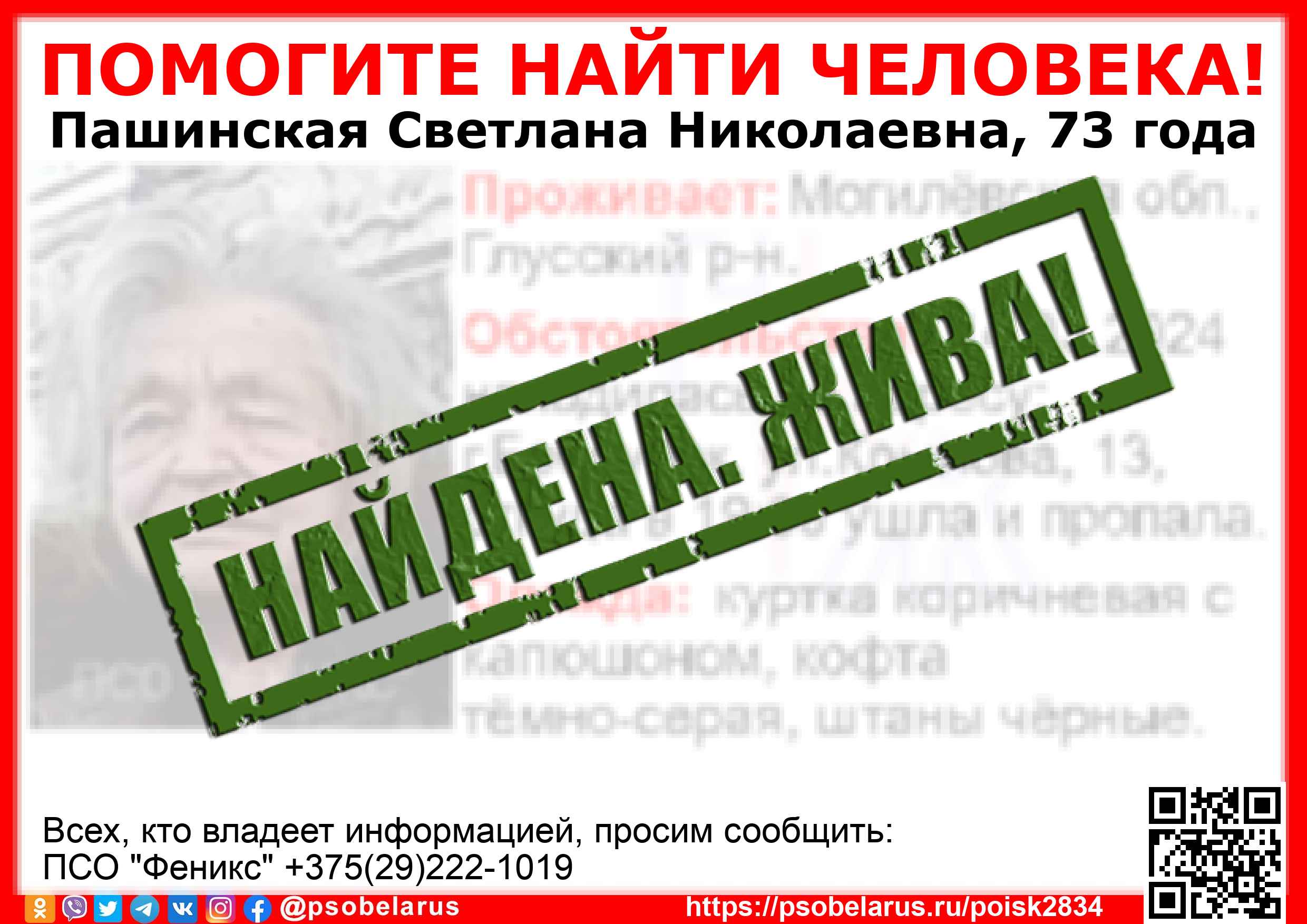 Всех, кто владеет информацией, просим сообщить: ПСО "Феникс" +375(29)222-1019 |