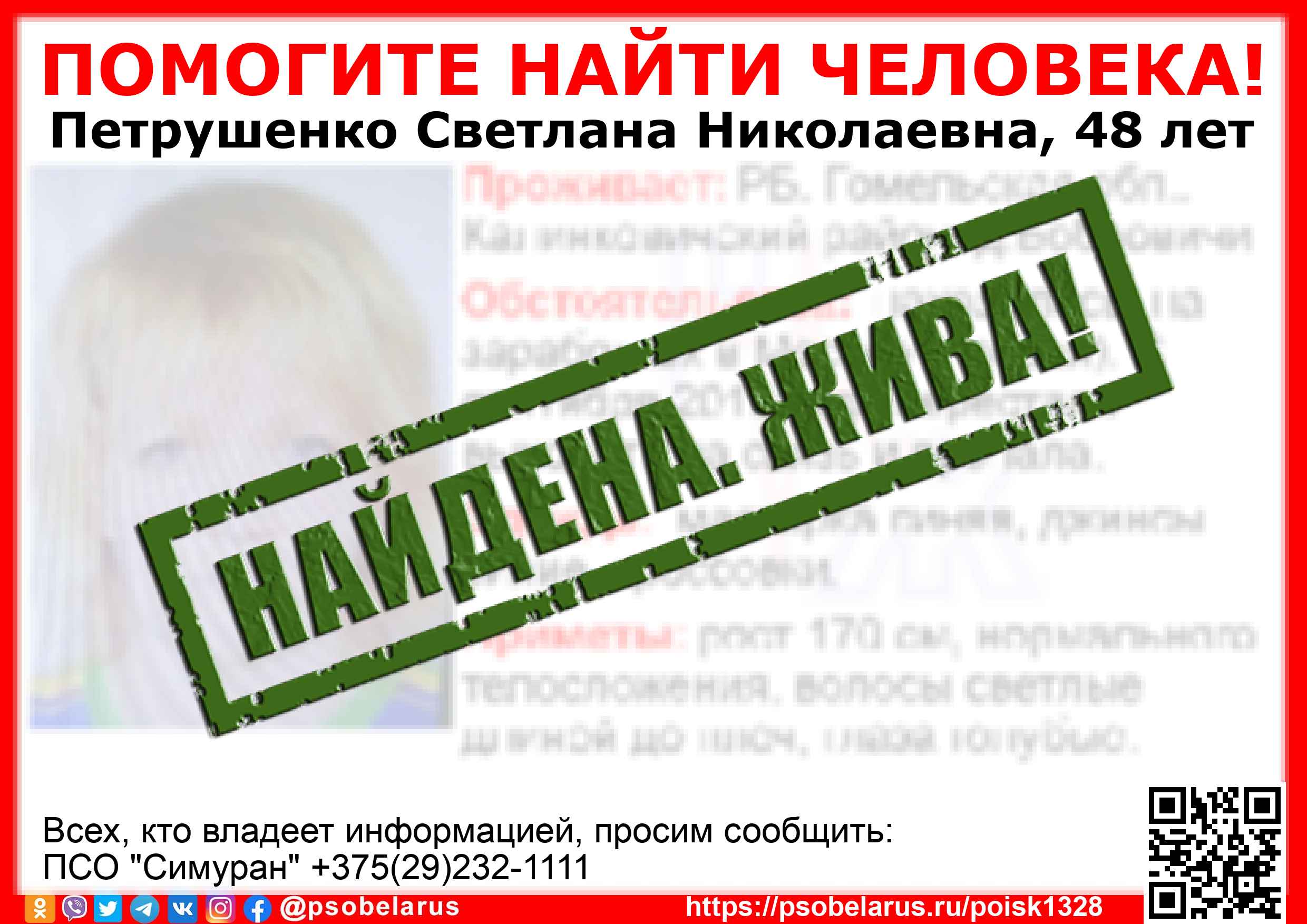 Всех, кто владеет информацией, просим сообщить: ПСО "Симуран" +375(29)232-1111 |