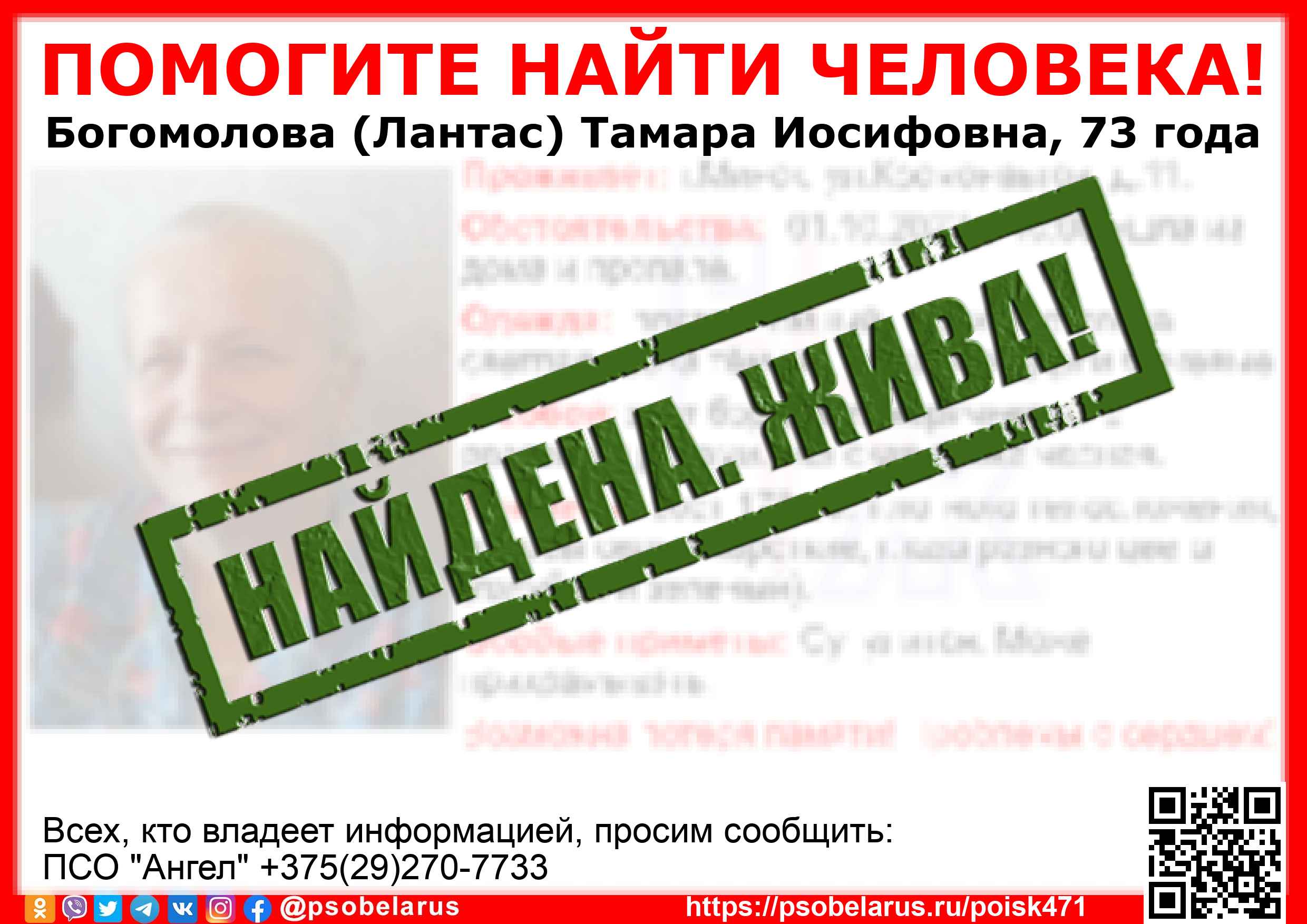 | Всех, кто владеет информацией, просим сообщить: ПСО "Ангел" +375(29)270-7733 |  |