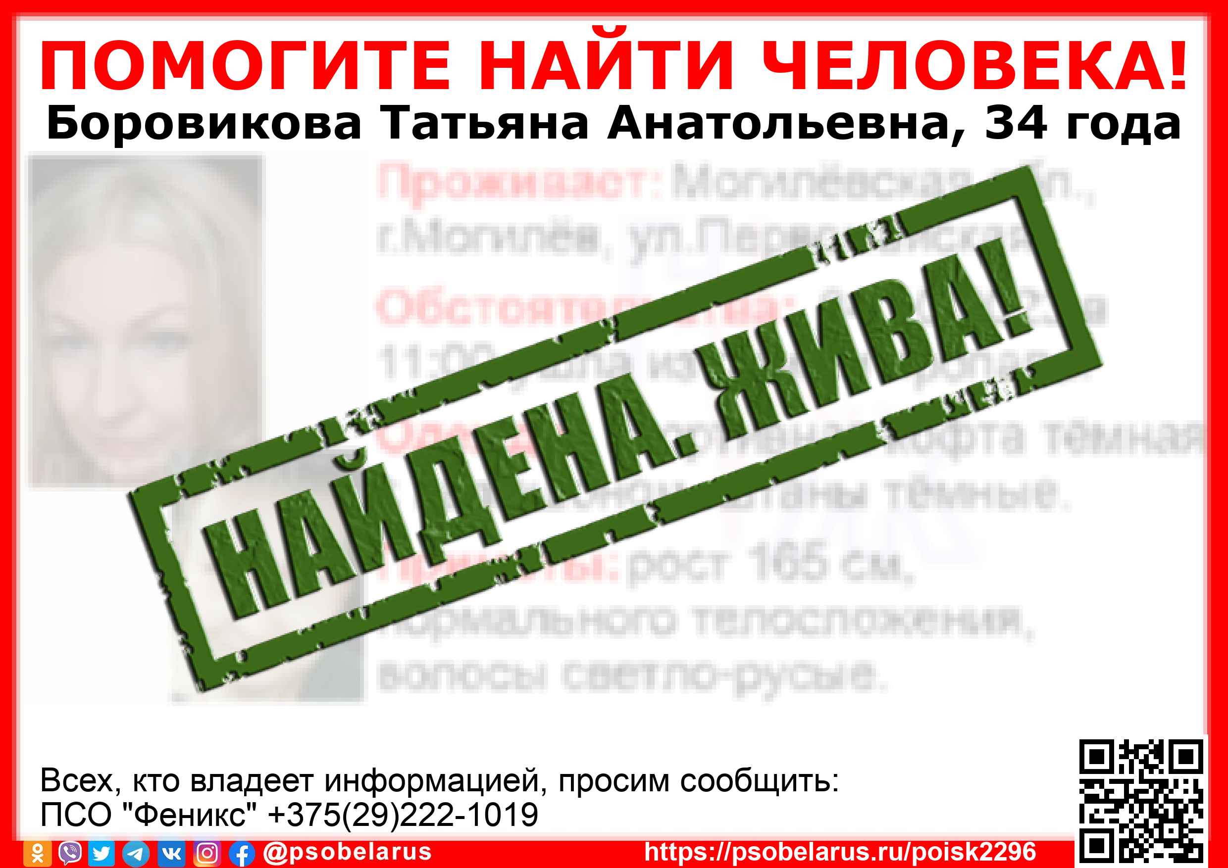 Всех, кто владеет информацией, просим сообщить: ПСО "Феникс" +375(29)222-1019 |