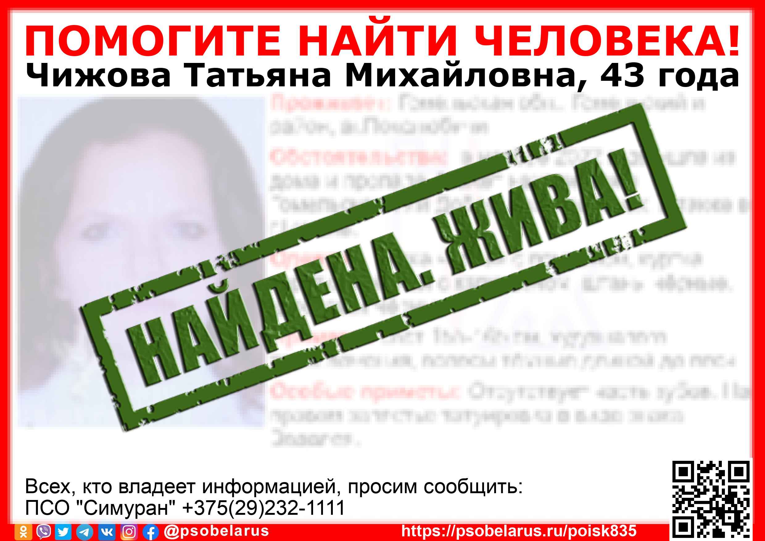 Всех, кто владеет информацией, просим сообщить: ПСО "Симуран" +375(29)232-1111 |