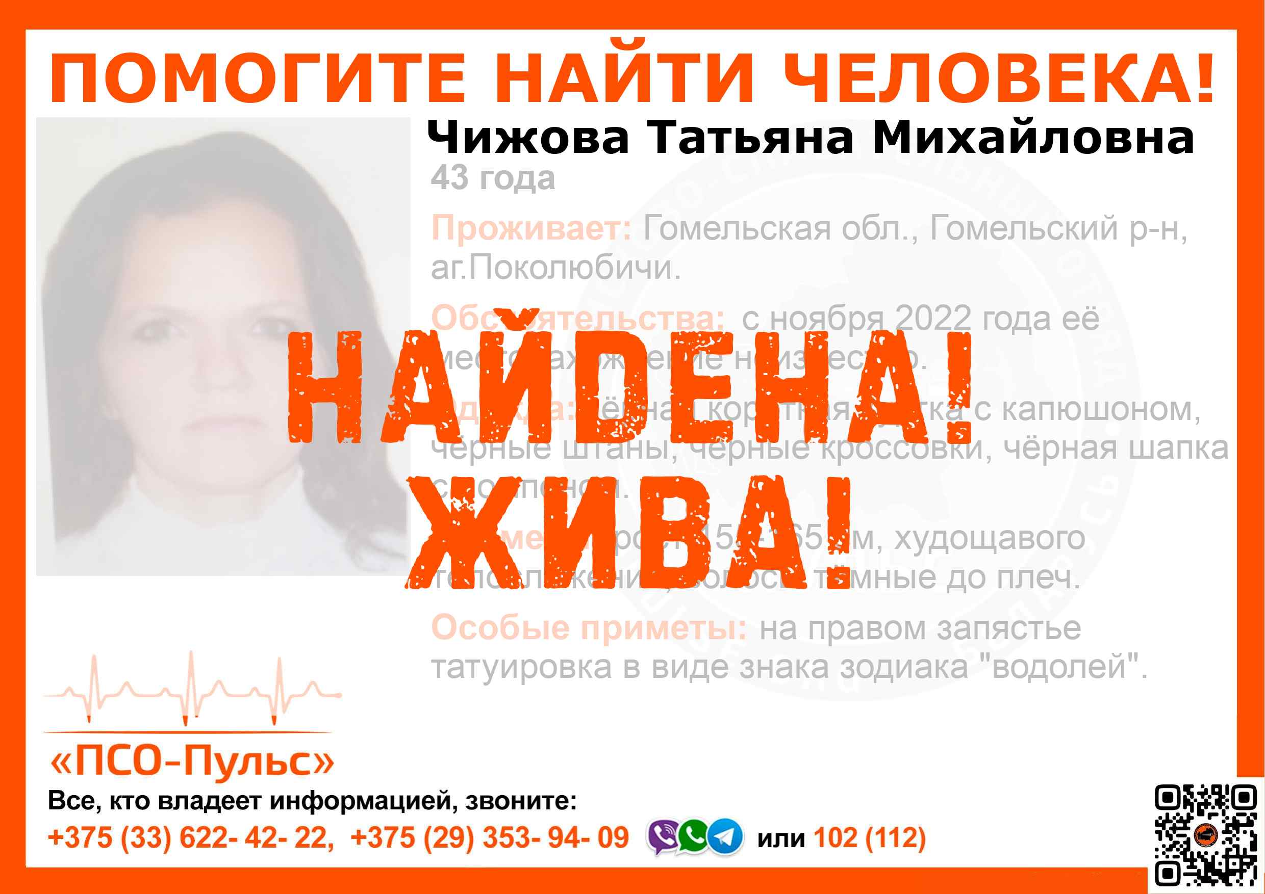 Всех, кто владеет информацией, просим сообщить: ПСО "ПСО-Пульс" +375(33)622-4222 |