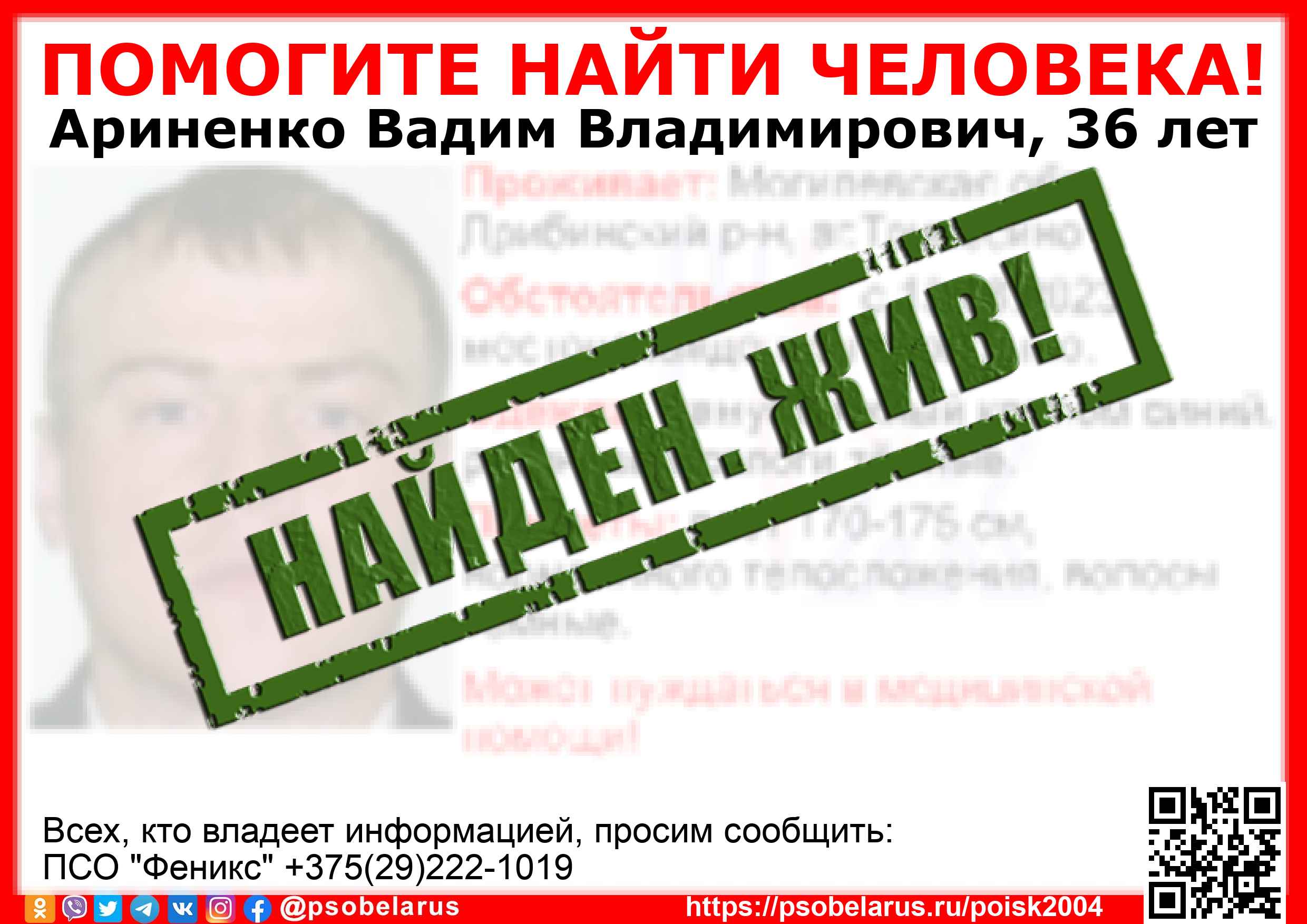 Всех, кто владеет информацией, просим сообщить: ПСО "Феникс" +375(29)222-1019 |