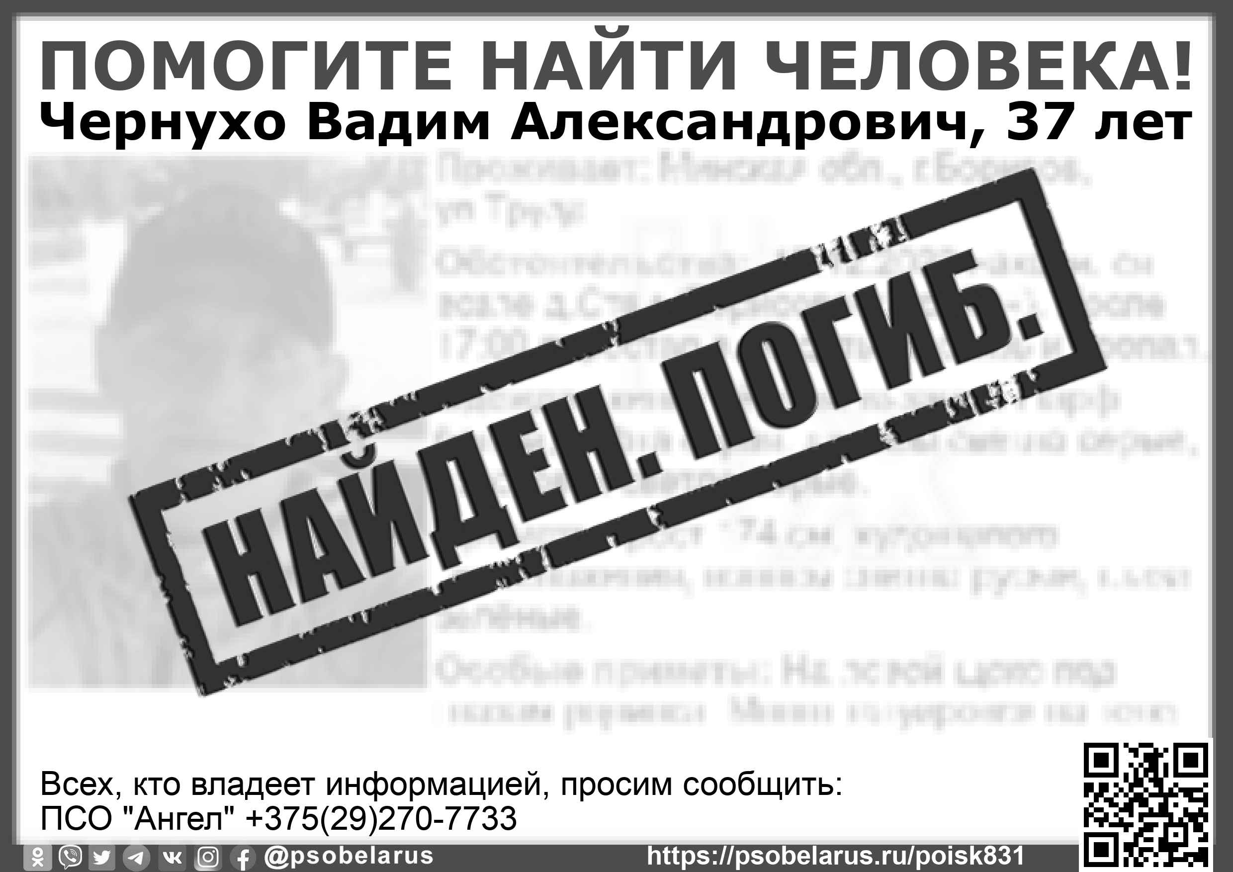 Всех, кто владеет информацией, просим сообщить: ПСО "Ангел" +375(29)270-7733 |