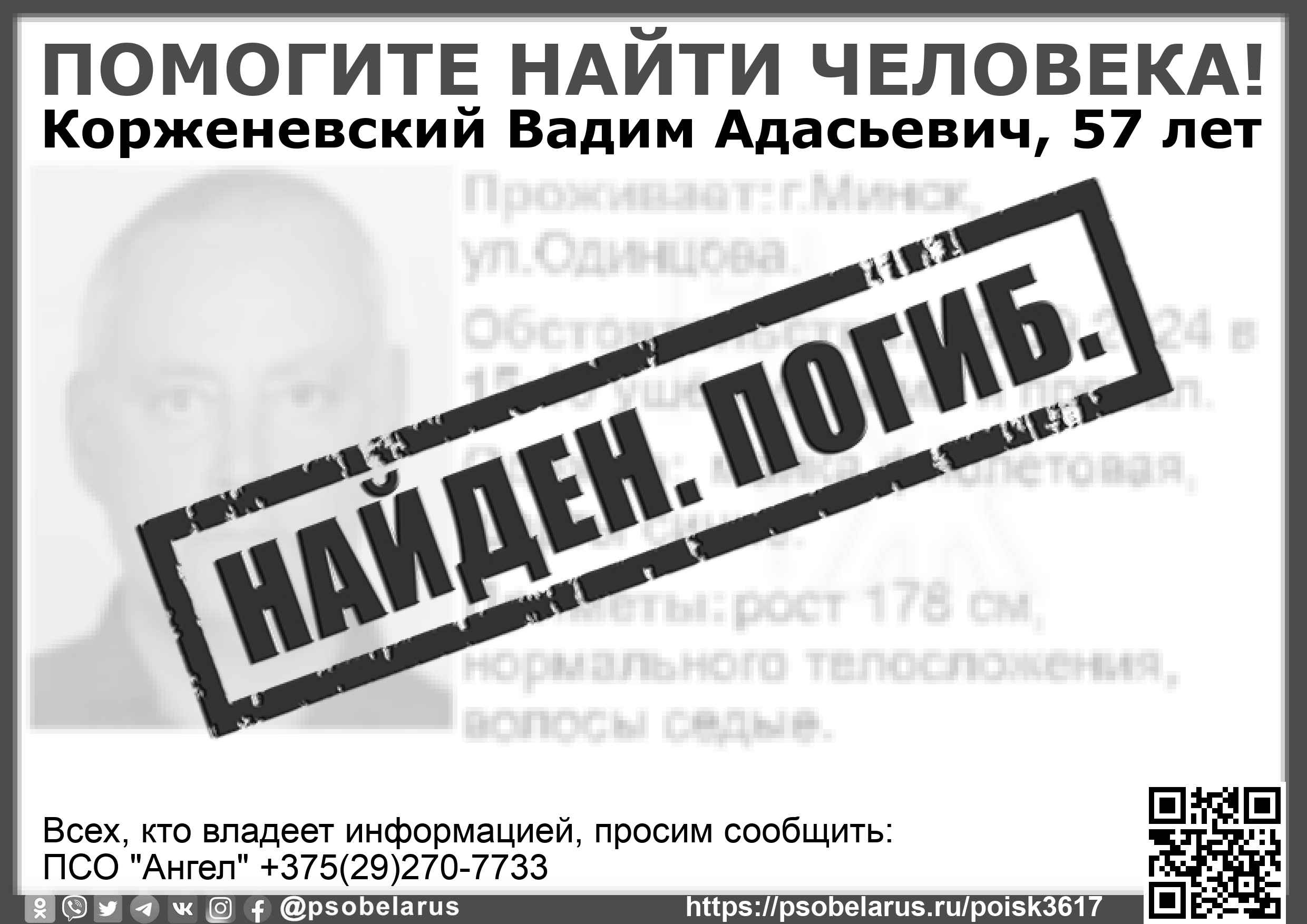 Всех, кто владеет информацией, просим сообщить: ПСО "Ангел" +375(29)270-7733 |